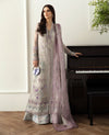 Adorn yourself in the luxurious Vola gown, featuring a grey front-open design with intricate embroidery and lilac accents for a glamorous allure. Fitted sleeves showcase delicate shifli embroidery and detailed stitching, while wide-leg trousers with vibrant botanical patterns add vitality. The matching grey dupatta dazzles with sequined floral sprays and lilac accents, creating a striking color block effect. Crafted from organza and raw silk with lilac sitara embellishments, this ensemble exudes opulence and grace.