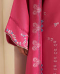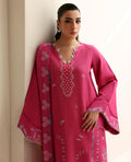 A soft and graceful bubblegum pink ensemble inspired by delicate French florals. The 3-paneled long-length shirt features intricate floral embroidery in subtle hints of pink and accent blue, creating a romantic and refined look. Paired with white embroidered culottes and a chiffon dupatta adorned with a 4-sided embroidered border, Florine captures the essence of femininity and effortless sophistication, beautifully crafted in luxurious cotton satin.