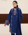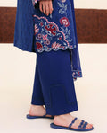 A mid-length Suzani shirt in a rich Persian blue hue, adorned with intricate Suzani embroidery in tones of red and coral. The neckline and sleeve borders are beautifully detailed with embroidery and delicate lace, adding a refined feminine touch. Paired with a chiffon dupatta featuring 4-sided embroidered borders and a plain trouser finished with lace detailing, Perle embodies elegance and timeless craftsmanship.