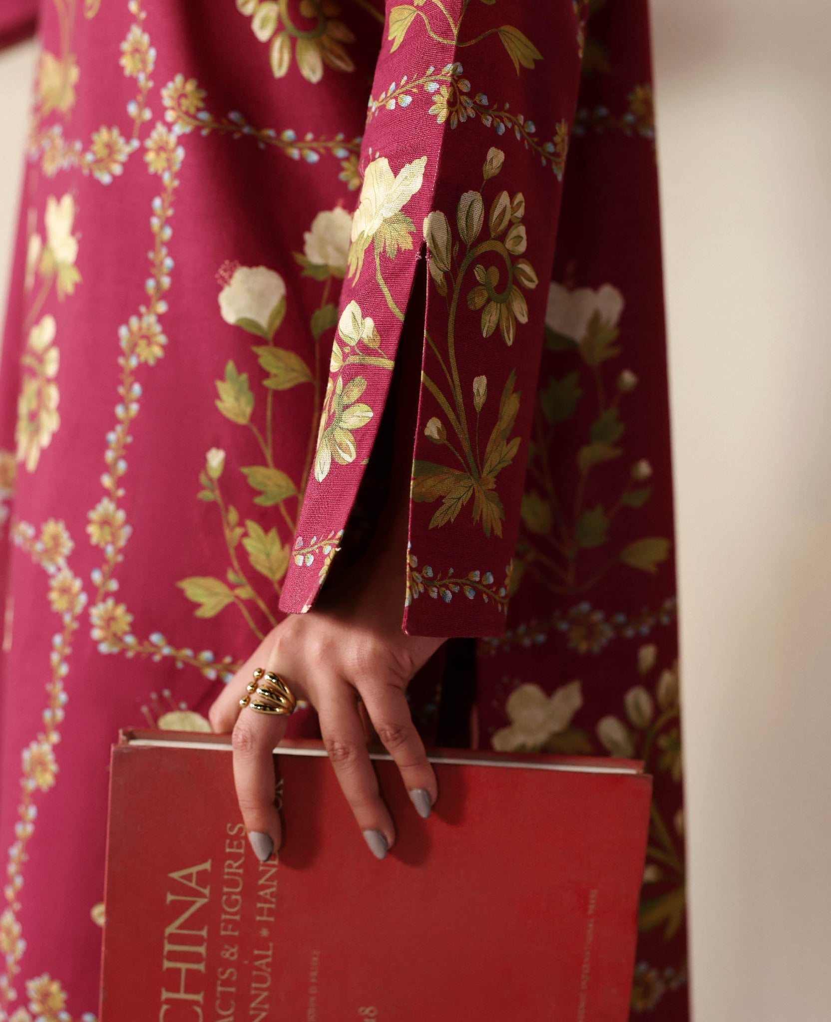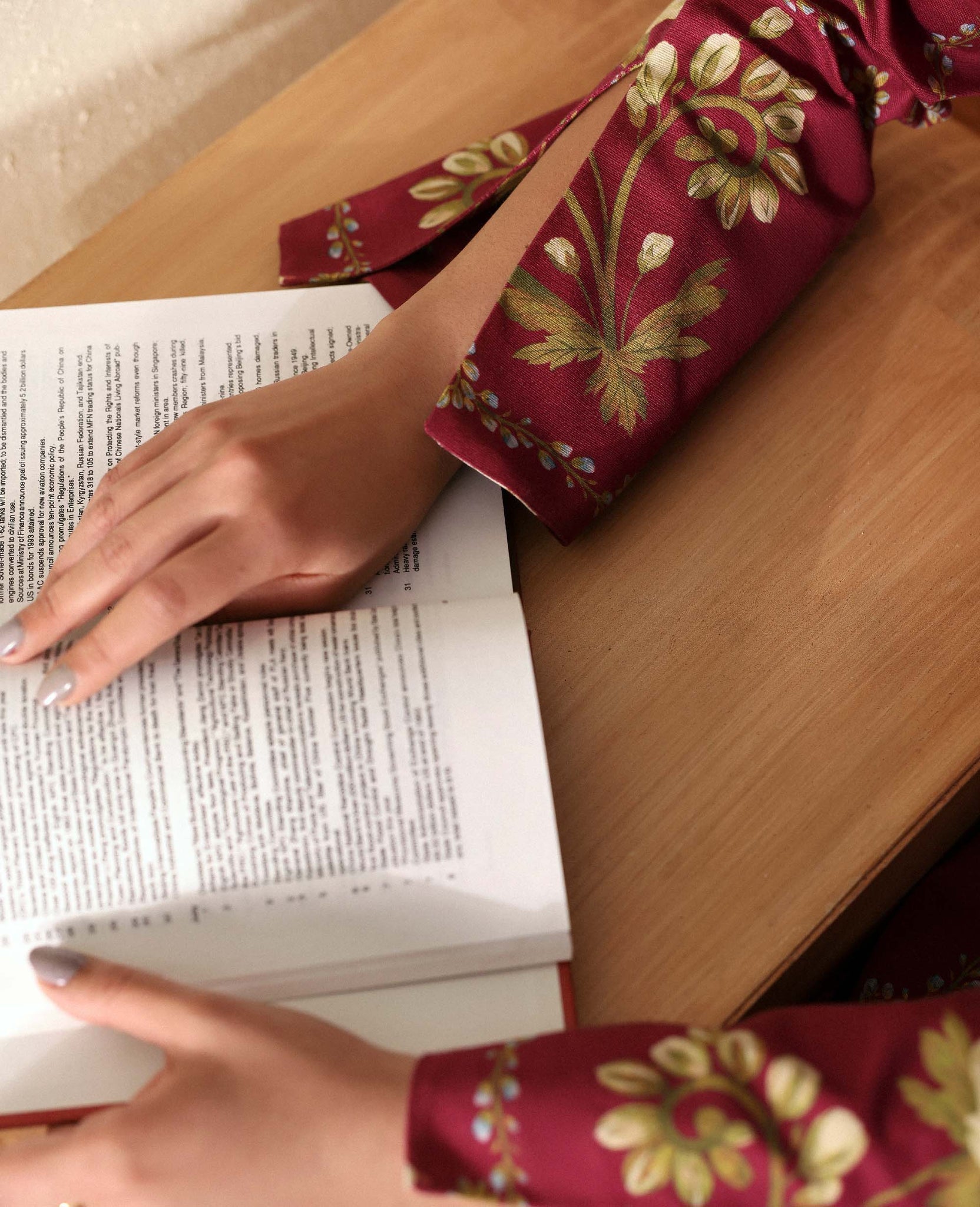A maroon printed shirt with an all-over floral design, paired with matching maroon trousers featuring subtle beige and green floral prints. The harmonious blend of bold florals and minimalist accents creates a sophisticated, yet vibrant look.