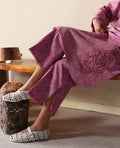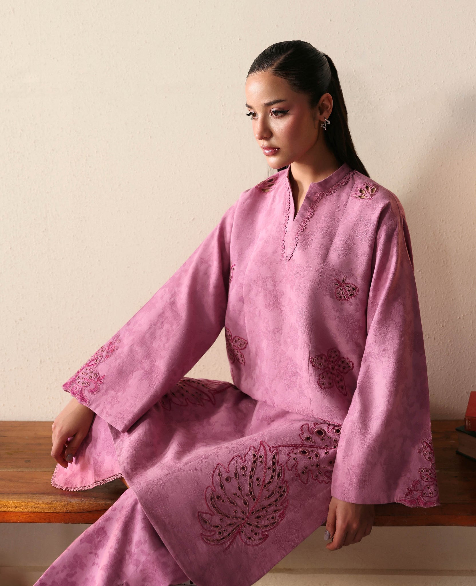 A pink jacquard shirt with a short silhouette and a rounded hem, paired with matching jacquard trousers. The inner panels are embroidered with delicate leaves and florals, while cut-out details add a modern, feminine touch to the overall look.