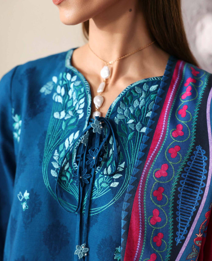 A symphony of sea-greens and blues flowing into a rich peacock hue, this three-panelled self-jacquard shirt is a vision of graceful transition. Delicate cutwork graces every panel, while the embroidered sleeves and coordinated trouser elevate the look with quiet sophistication. Paired with a vibrant, intricately printed Twill Marina shawl, the ensemble blooms with color, texture, and timeless allure.