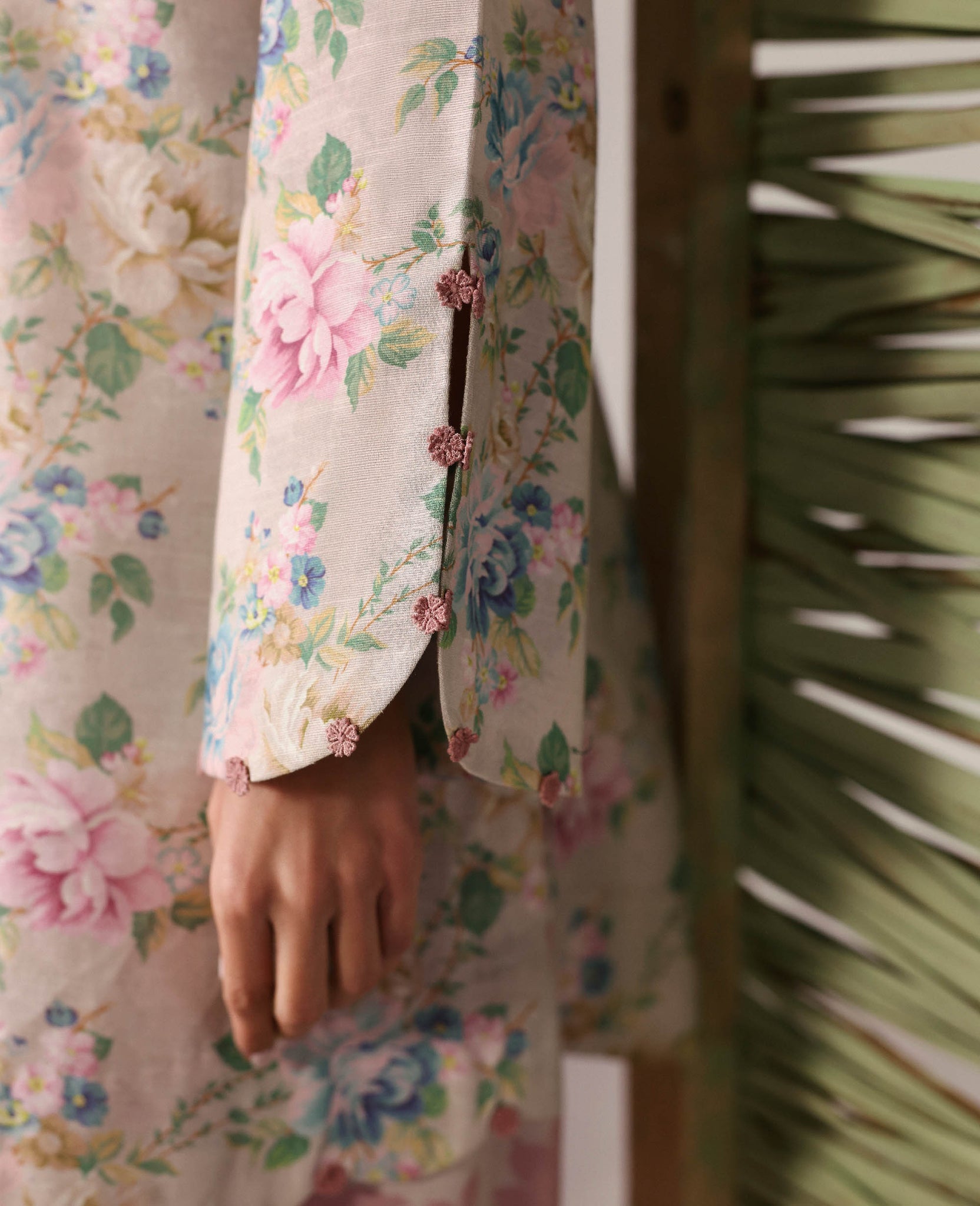 A cream shirt with a colorful, all-over floral print, paired with matching trousers featuring a single-tone peach print. The contrast between the vibrant shirt and the understated trousers creates a balanced, yet strikingly beautiful look.