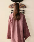 A powder pink shirt featuring a composed print on the front, paired with matching trousers that have subtle wavy prints along the hem. The soft, monochromatic tones create a gentle and serene look, exuding understated elegance.