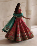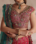 Radiant in hot pink raw silk, this lehenga celebrates festive charm with a bold yet graceful spirit. The shikargah inspired blouse dazzles with intricate adda work where muted rosewood florals bloom across the bodice, kissed with golden sequins that shimmer with every movement. The neckline framed in an ornate gold jaal, lends a regal aura to the silhouette balancing the vibrance, a contrasting teal dupatta cascades in harmony, adorned with vertical floral vines and delicate detailing for depth and dimension. A true ode to heritage and craftsmanship, this ensemble blends bold color play with timeless artistry designed to leave an unforgettable impression.