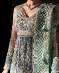 Ethereal in white, this paneled net shirt blooms with soft blush florals, muted greens, and ivory embroidery across its delicately adorned bodice. A silver sequin border traces the hem with a subtle sparkle, infusing grace with just the right touch of glamour. Paired with a striking green lehenga, the contrast feels bold yet refined, while the sage organza dupatta finished with a floral border and intricate geometric accents wraps the look in timeless charm. A perfect harmony of modern elegance and feminine allure, designed for festive soirées and unforgettable celebrations.