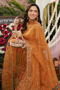 The tangerine hued lehenga choli is the epitome of festivities. With the choli having a boat neckline, it is adorned with heavy sequin work on the front, back & sleeves along with textured thread embroidery of different touches of contrast to pop the festive glam up. The back is adorned with heavy handmade tassels. The neckline of the choli & lehenga comprise of heavy hand Adda embellishments featuring kora, dabka, sitari, stones and crystals along with thread embroidery & sequin work. The lehenga is filled with the burst of embellished and embroidered floral motifs and patterns with gold & different contrasting color accents. Topped with embroidered & embellished organza dupatta with pallu side heavy borders and contrasting organza applique, the dupatta is bejeweled with mini motif spray, embroidered & multi toned borders finished with minimal lace.