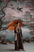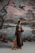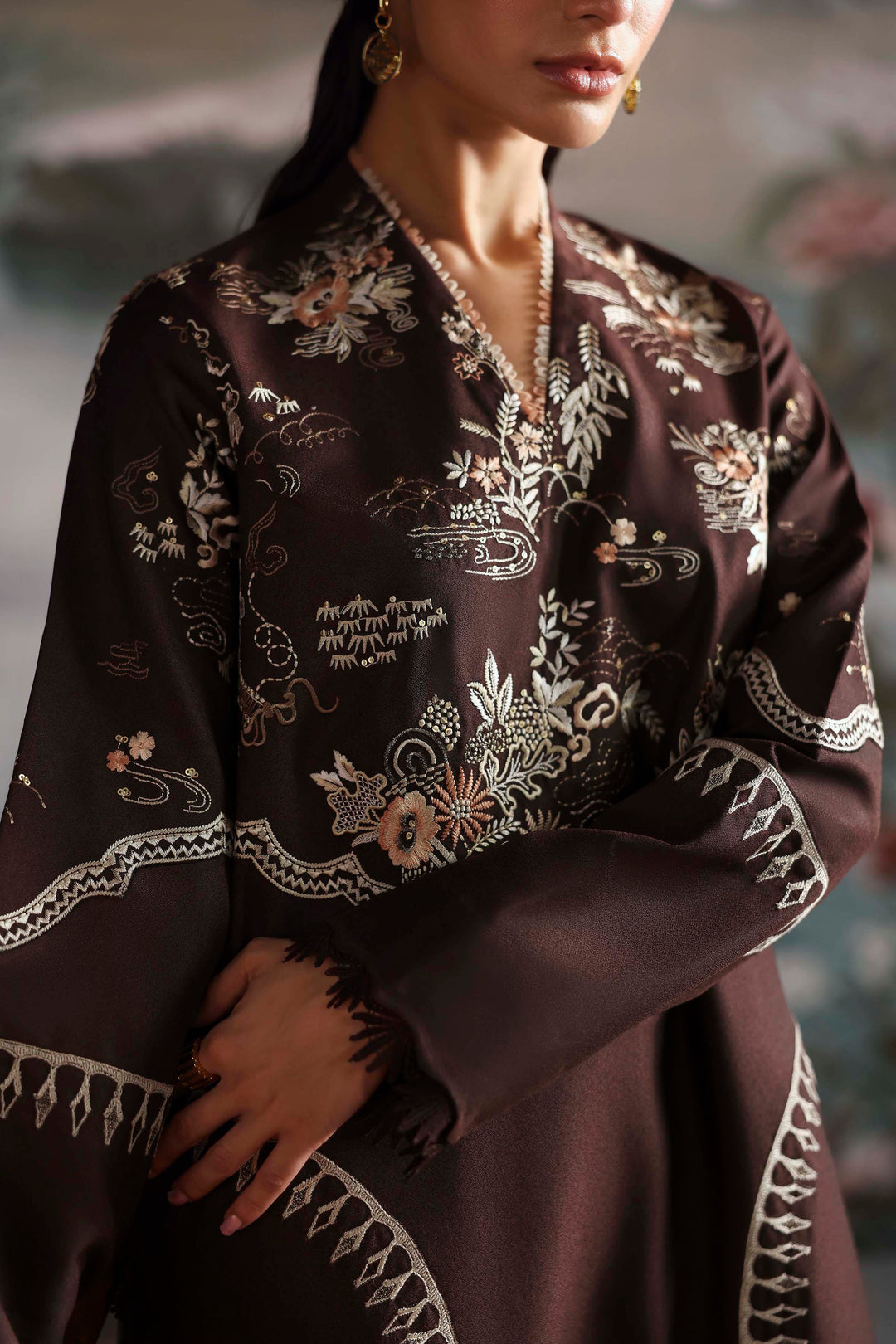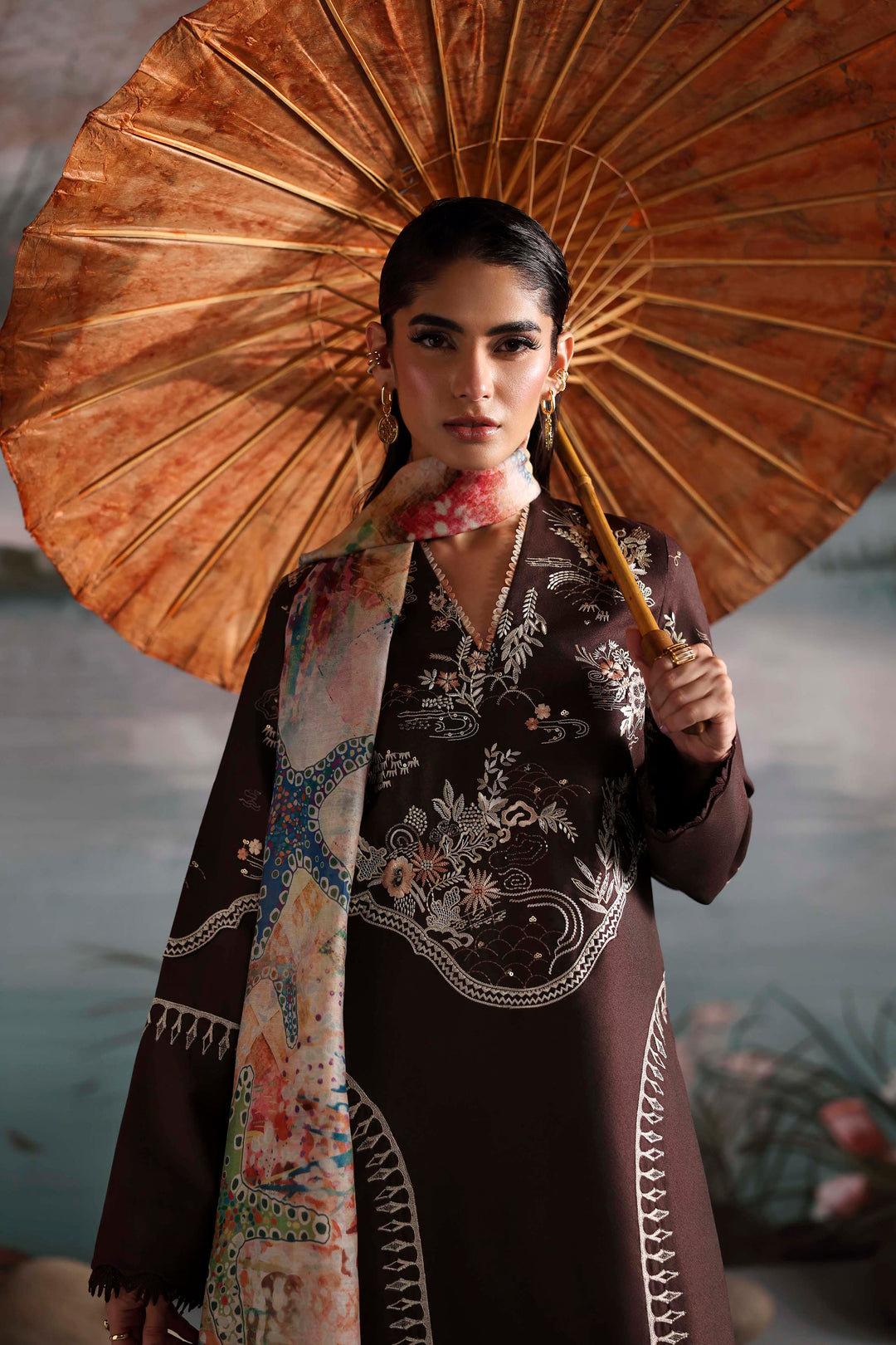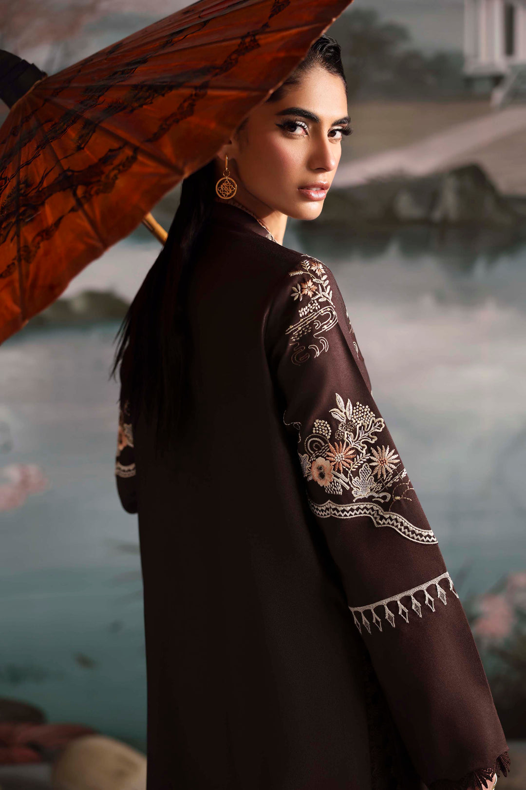 A rich chocolate brown ensemble crafted from thick winter silk fabric, exuding warmth and sophistication. Paired with an imported 100% silk-wool shawl featuring traditional Nikko Shishi Japanese embroidery. A beautifully designed luxury pret 3-piece for timeless elegance.
