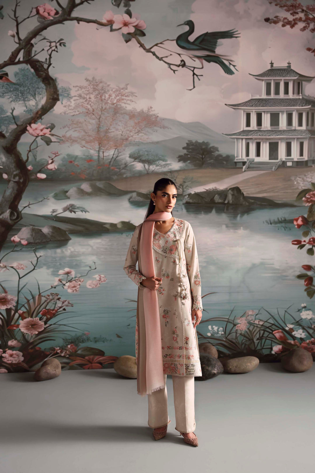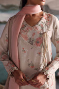 An elegant almond-colored thick silk outfit adorned with delicate blossom prints in beige, cream, and soft peach tones. Paired with an imported silk-wool scarf in soothing shades of peach and beige for a refined, timeless look.