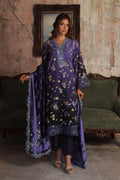 Turn heads this season with this elegant purple ensemble, blending tradition with modern charm. The outfit showcases an enchanting floral print in hues of lilac, ivory, and soft yellow over a rich purple and black base. Intricate lace embroidery adorns the neckline, sleeves, and hem, adding a touch of delicate sophistication. Paired with straight trousers for a sleek silhouette, the outfit is elevated with a flowy printed shawl that ties the entire look together.