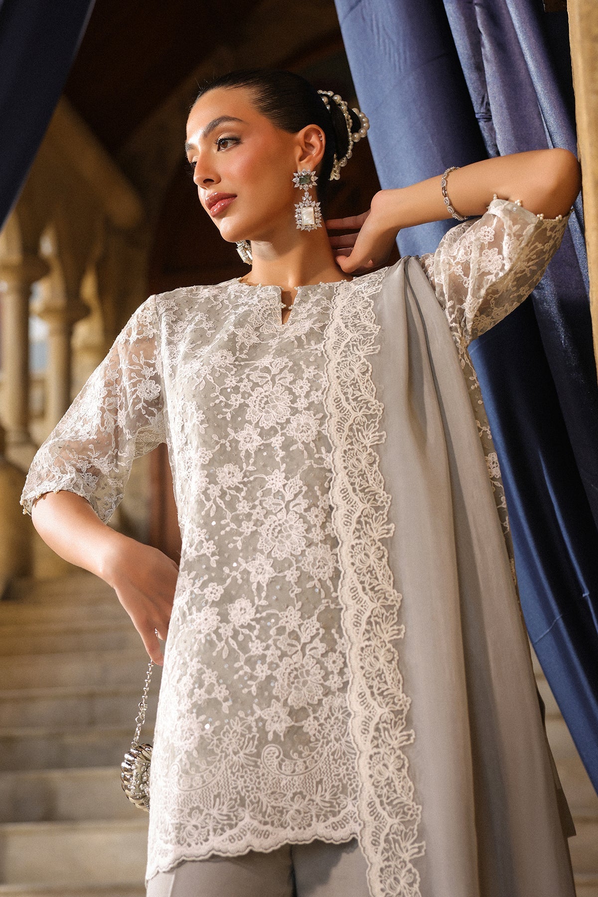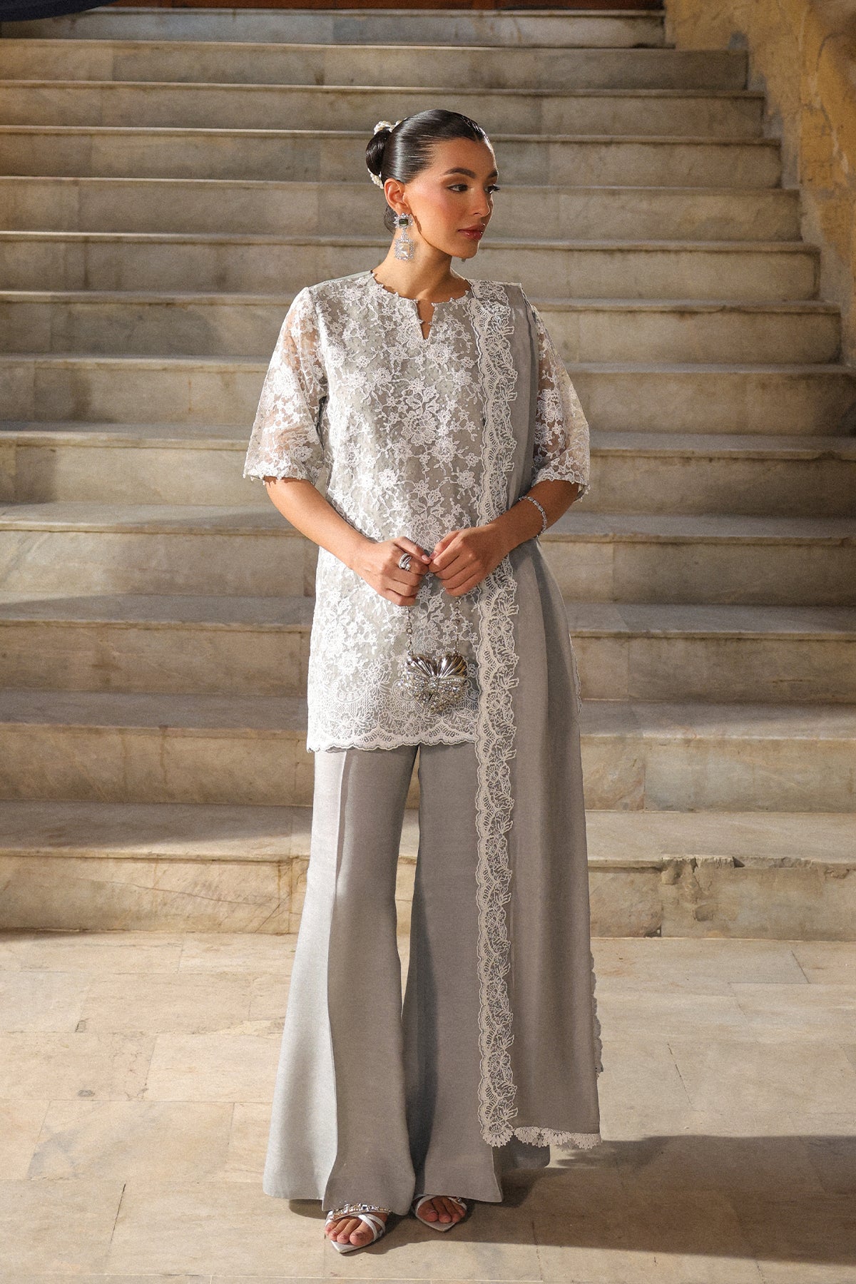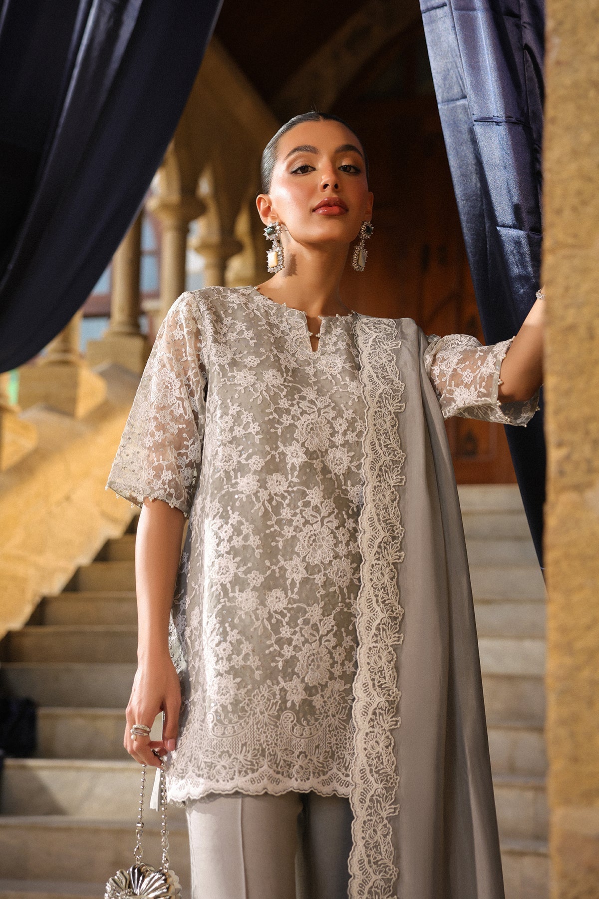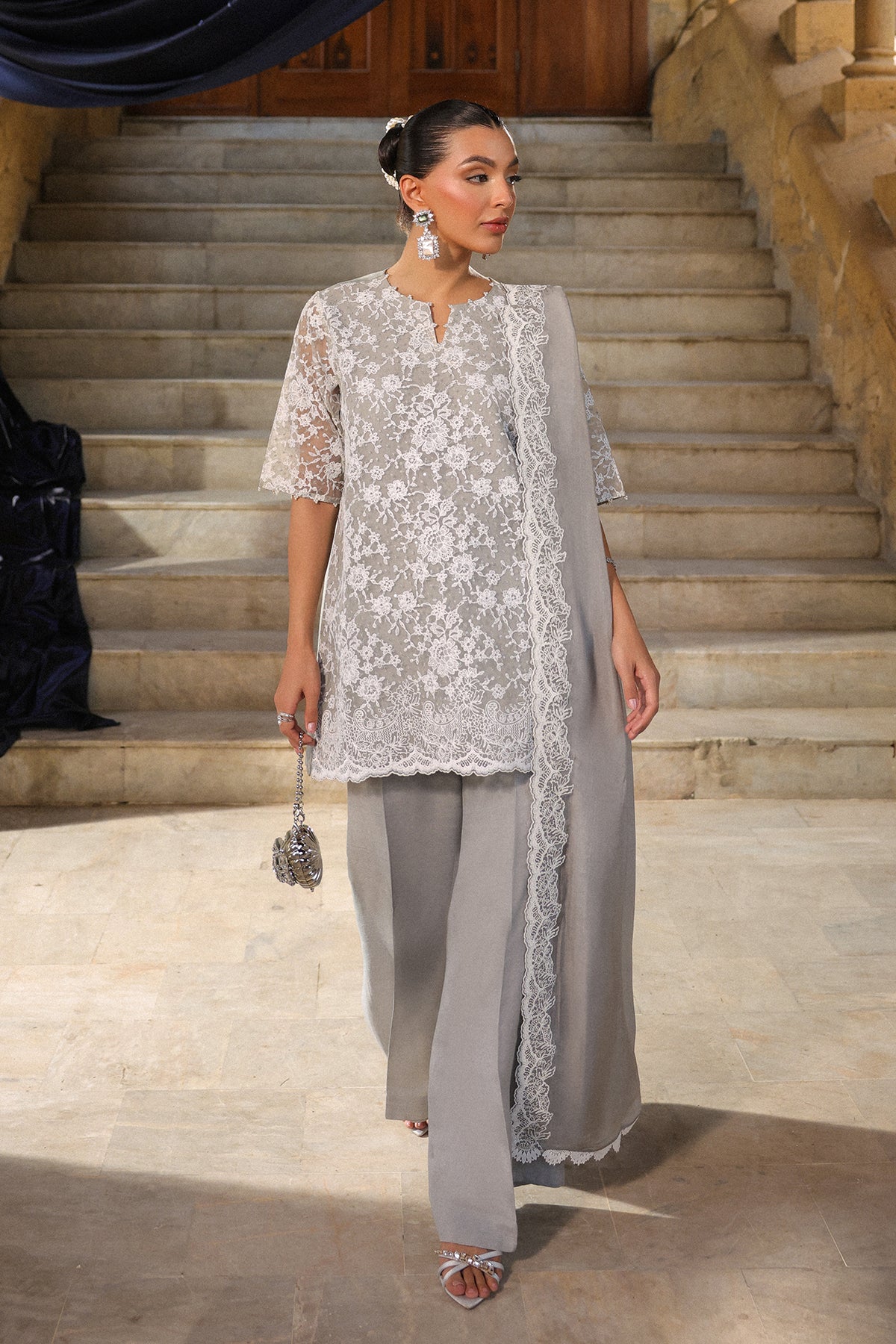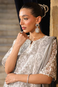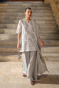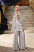 Stunning Silver grey outfit. The kameez featuring intricate Zari and Resham embroidery on the front and sleeves. The voluminous, pleated shalwar ensures majestic movement and comfort.