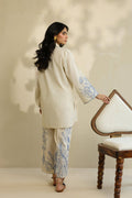 An ivory co-ord set adorned with intricate electric blue botanical embroidery. Featuring gracefully dancing botanic on the sleeves and culottes, and finished with a smart shirt collar for an effortlessly elegant look.