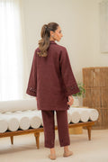 A contemporary cherry red cord set featuring a notch collar shirt with loose, stylized sleeves. Paired with straight-cut pants, the look is elevated with artisanal fabric manipulation detailing along the sleeve and pant borders, adding a modern touch to this refined ensemble.