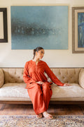This outfit features a rust-coloured kurta with a straight cut, adorned with a subtle grid pattern and delicate multicolored floral embroidery. Paired with a matching wide, pleated shalwar, it blends a modern traditional look with timeless elegance