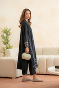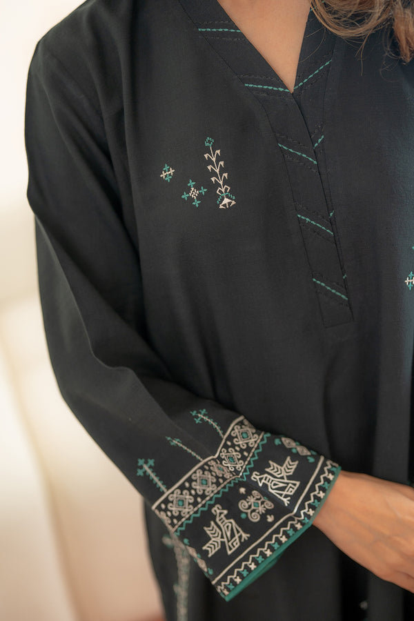 A striking black ensemble featuring a long shirt adorned with contemporary Aztec embroidery in cool tones, highlighted by subtle teal accents. Paired with straight pants for a bold, modern look.