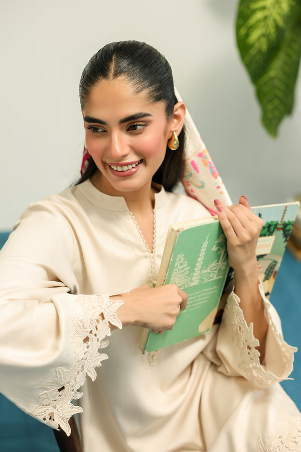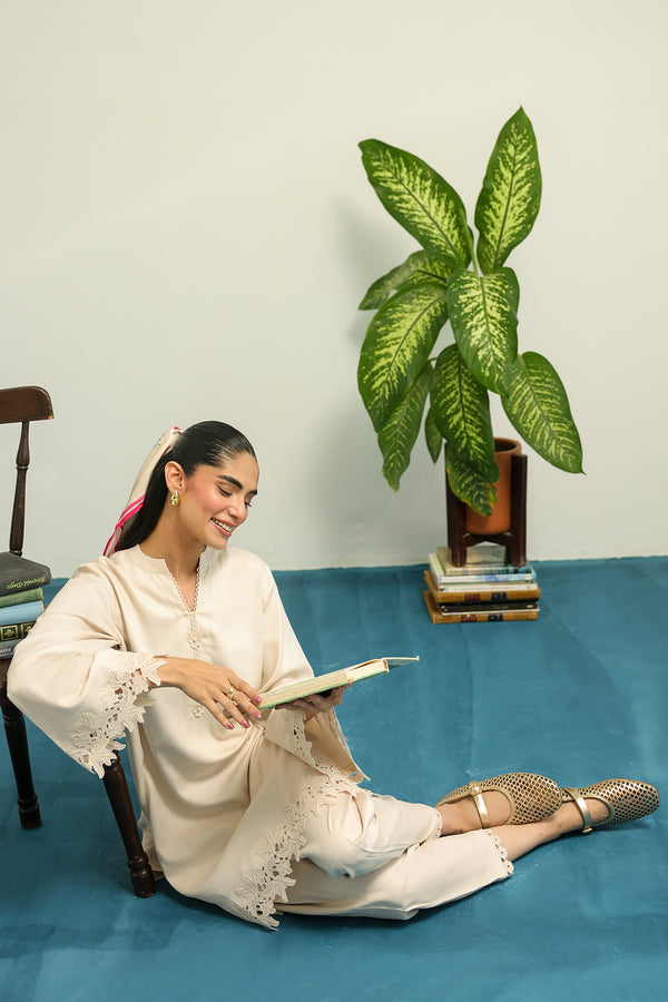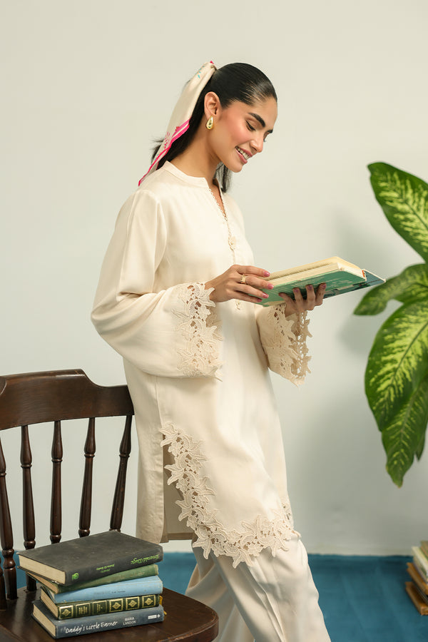 This elegant outfit features a straight-cut shirt with a rounded lace border and floral appliqué neckline for a refined, handcrafted touch. The long sleeves with matching lace add balance and cohesiveness. Paired with it is a classic shalwar with a slightly tapered cut, featuring lace trim at the hem for an elegant finish.