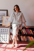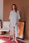 The shirt features a soft pleated front with a contemporary statement collar and intricate tonal embroidery of stylized leaves near the hem and sleeve cuffs, adding a refreshing artisanal touch. The straight trousers are finished with coordinating geometric embroidered borders, completing the refined aesthetic.