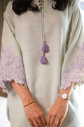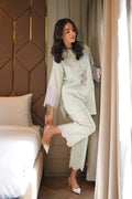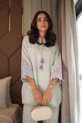 An ethereal mint co-ord set adorned with soft lilac lace detailing on flared sleeves and a dainty lace-trimmed neckline. The shirt's minimal silhouette exudes understated elegance, while the straight-cut trousers feature delicate lace inserts along the hem, adding a graceful feminine finish.