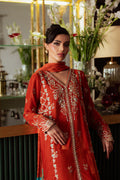 A harmony of earth and elegance €” Neelam is a three-piece ensemble that redefines fluid sophistication. The shirt features embroidery and ada work across the front, back, and neckline, paired with culotte pants finished with a graceful border at the hem. A striking tie-and-dye medium silk dupatta with a velvet border completes the look, making this bold outfit perfect for the season.