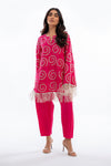 A hot pink relaxed fit kurta is cut from rawsilk and rendered with eyelet embroidered spirals and a neckline adorned with fabric manipulated details. Finished with a fringe trim along the sleeves and hemline, the kurta is paired with a matching rawsilk shalwar.