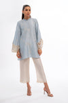A relaxed silhouette cut from rawsilk, this sky blue shirt is adorned with delicately embroidered floral motifs with a pleated collar. Complemented with embroidered detailing on the fan shaped sleeve cuffs, the shirt is paired with cream rawsilk culottes featuring a cutworked hem.