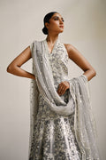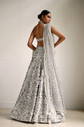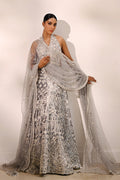 A celestial peshwas in ash silver tissue, lavishly adorned with ivory eyelet embroidery, sequins, and mirror accents that weave a tapestry of timeless romance. The sleeveless bodice, cut in a plunging V, flows into a voluminous flare layered with intricate detailing. A sheer tulle dupatta, edged with scalloped embellishment and scattered mirrors, drapes with regal poise, completing the ethereal ensemble.