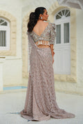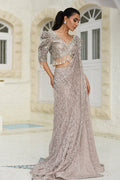 An ethereal saree in muted lilac, draped in diaphanous French tulle, dusted with sequins and tonal embroidery, and finished with pearl tassels. The sculpted tissue blouse stuns with opulent cutwork, zardoze embellishment, and dramatic puffed sleeves that cascade into a fringe of beaded drops. Paired with a pre-draped French tulle dupatta gathered on one shoulder and edged with bead tassels, the ensemble whispers haute couture elegance with a modern, sculptural edge.