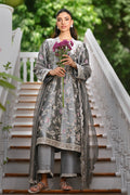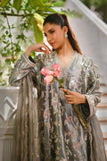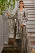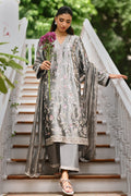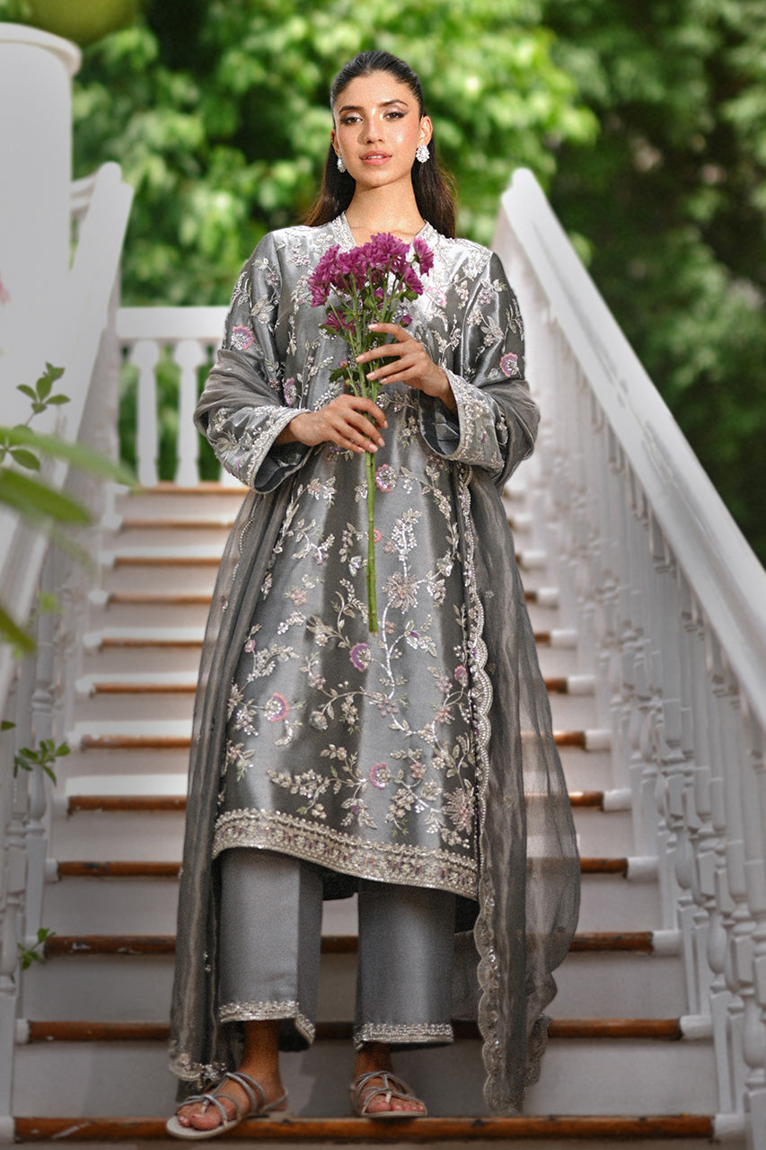 A timeless symphony in an ash silver hue, softened with lilac and blush threads, this ensemble captures quiet elegance with refined artistry. The straight long kameez in lustrous tissue is lavishly adorned with floral resham and zardoze embroidery, accented with delicate sequins. Its neckline and borders are framed with intricate vines, while the sleeves are finished with embroidered hems. Paired with matching pure raw silk culottes, their hems lightly embroidered to echo the florals of the shirt, the look is completed with a sheer tissue dupatta, feather light with zardoze embellishment and scalloped edges, a final note of graceful fluidity.