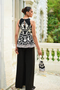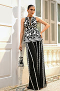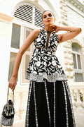 In sheer ebony khaddi corduroy layered over crepe, this sculpted peplum is embroidered with ivory florals and edged with diamant© accents. A deep slit neckline with a tulle insert lends a touch of modern sensuality. Flowing palazzo trousers in georgette, defined by vertical embroidered panels, create a statuesque grace. The ensemble allows its crisp tailoring and bold geometry to speak with quiet confidence. A coordinating embroidered pouch, finished with pearl tassel accents, completes the look with vintage charm.