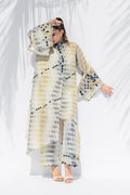 A canvas of eucalyptus green, beige, and indigo silk, this ensemble explores geometry through bold, abstract design. The relaxed shirt features an asymmetric hem, a band collar, and a button-down placket, with geometric appliqué and tukri detailing adding depth to the design. Fluid bell sleeves are elegantly finished with appliqué in shades of indigo and gold and a cutwork hem. Paired with complementary culottes that echo the artisanal tukri work, the look forms a cohesive, contemporary print-on-print expression.