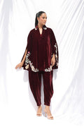 Rendered in deep burgundy velvet, this cape kurta is a study in modern regality. The flowing silhouette features slit sleeves adorned with pastel resham florals, appliqué details, and metallic zardoze accents that shimmer softly against the plush base. Paired with a matching velvet balloon shalwar, the ensemble is an ode to contemporary femininity.