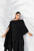 This sophisticated ebony toned ensemble is crafted from Italian crepe, giving it a fluid movement. Featuring a draped, off shoulder poncho top paired with dramatic wide leg palazzos, the look is entirely minimalist, defined by the generous volume and the fabric's luxurious drape.