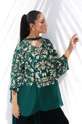A deep emerald hue defines this effortlessly regal ensemble. The boxy georgette kurta is adorned with ivory dori embroidery and velvet appliqué that bloom across the bodice and sleeves, finished with delicate 3D trims. Paired with a matching velvet tube top and plush velvet shalwar, the draped silhouette evokes quiet splendor. A minimalist pre draped georgette dupatta completes the look with fluid grace.