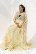 Soft as morning light, this ethereal ensemble evokes a garden in bloom. The long organza angarkha in pale buttercream is printed with painterly florals in blush, peach, and sage. Each gota detailed motif trails gracefully along the silhouette, while a gota edged placket lends a touch of subtle luminosity. Layered over a peshwas with a velvet bodice featuring zardoze and resham embroidery and a khaddi silk flare, the look is finished with a cascading ruffled hem that adds gentle movement to its timeless charm.