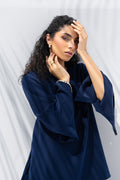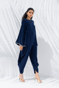 Exuding sophisticated flair in rich midnight blue Italian crepe, this ensemble offers a contemporary take on classic tailoring. The relaxed top features flared full sleeves, subtly accented at the cuffs with delicate diamanté embellishment. Paired with a softly draped shalwar in a matching hue that gathers gracefully at the ankle, the look is defined by clean lines, tonal depth, and effortless fluidity.