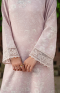 Elmiya is a two-piece unstitched winter outfit in slub viscose,featuring a dusty rose base with tonal floral prints. Accentedwith delicate lace trims on the sleeves and trousers, it blendswarmth with quiet elegance perfect for effortless winterwear.