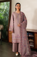 Laverra embodies effortless sophistication in mauve desert. The slub viscose shirt features delicate resham embroidery on the neckline and sleeves, blending floral and geometric motifs with refined artistry. Paired with a plain trouser and a printed blended shawl in soft hues, it creates a harmonious look of understated elegance €” timeless, graceful, and modern.