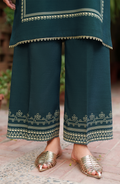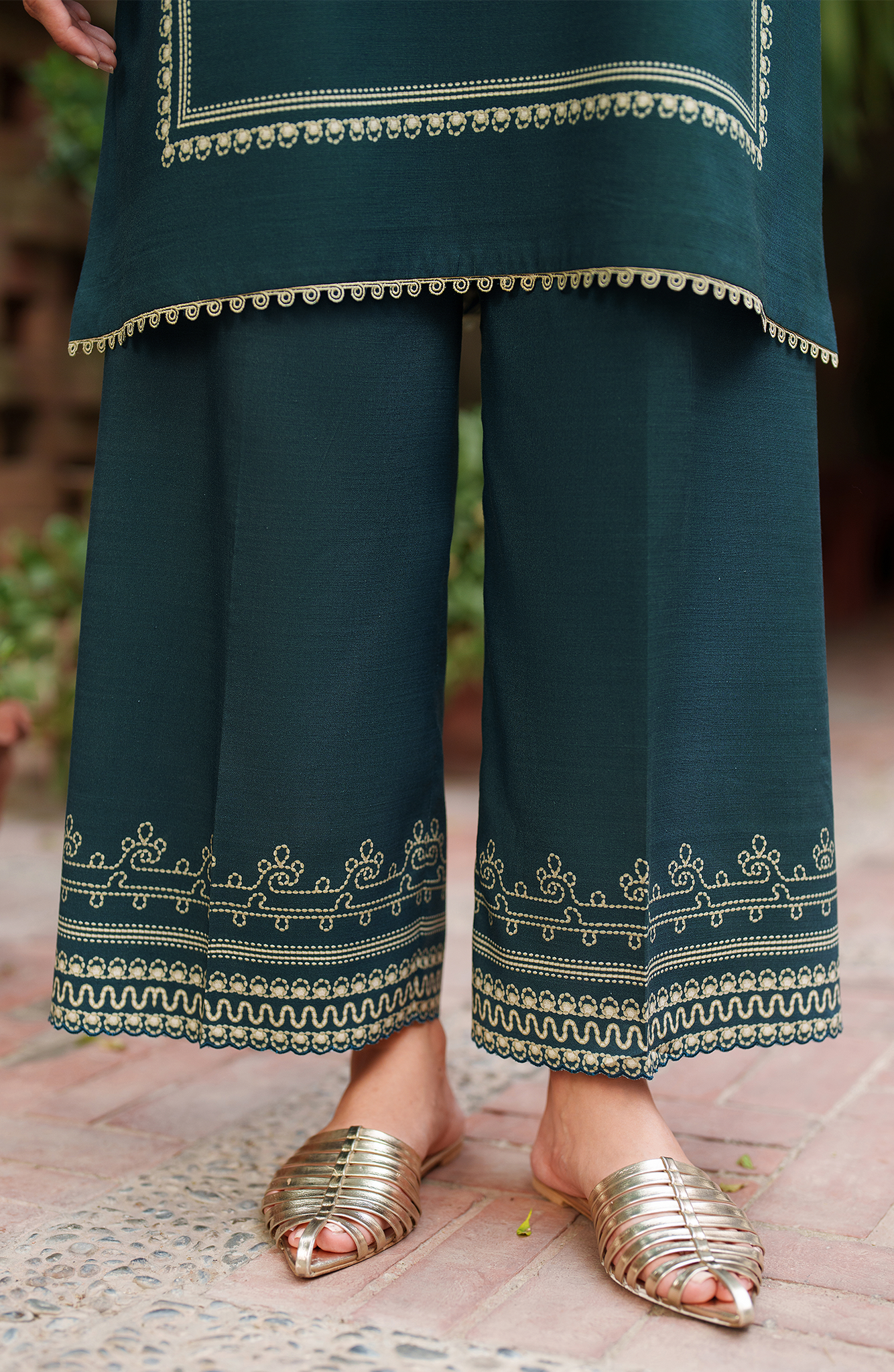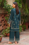 Verdure is a two-piece unstitched winter set in slubviscose. Adorned with delicate beige embroidery on adeep teal base, it offers a perfect blend of warmthand elegance. Ideal for effortless daytime or semiformal winter looks.