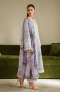 A soft lavender three-piece set featuring a digital printed cambric shirt with embroidered neckline, embroidered sleeve and trouser borders, paired with a digital printed chiffon dupatta and dyed cotton trousers for a look of effortless elegance.