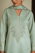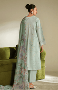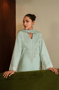 A pastel mint three-piece ensemble crafted to enchant. The cambric shirt features digital floral prints adorned with a beautifully embroidered neckline and delicate embroidery along the front side borders, adding subtle dimension and elegance. A blended chiffon dupatta with dreamy floral art enhances the romantic tone, while the dyed cotton trousers offer comfort with a clean finish.