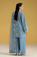 A 3-piece cotton outfit in a serene powder blue shade. The shirt is adorned with white thread and cutwork embroidery across the front and sleeves hem, finished with scalloped edges. Straight trousers keep the look refined and balanced. A cotton net dupatta with embroidered floral detailing completes the look with breezy elegance.