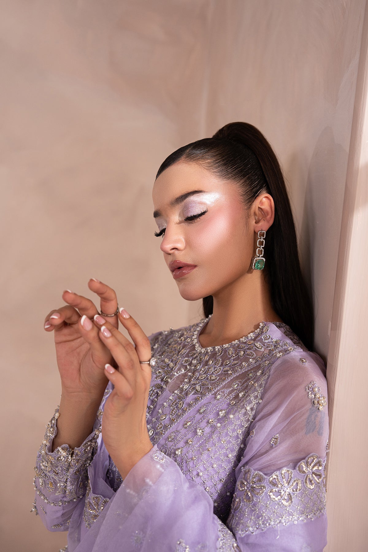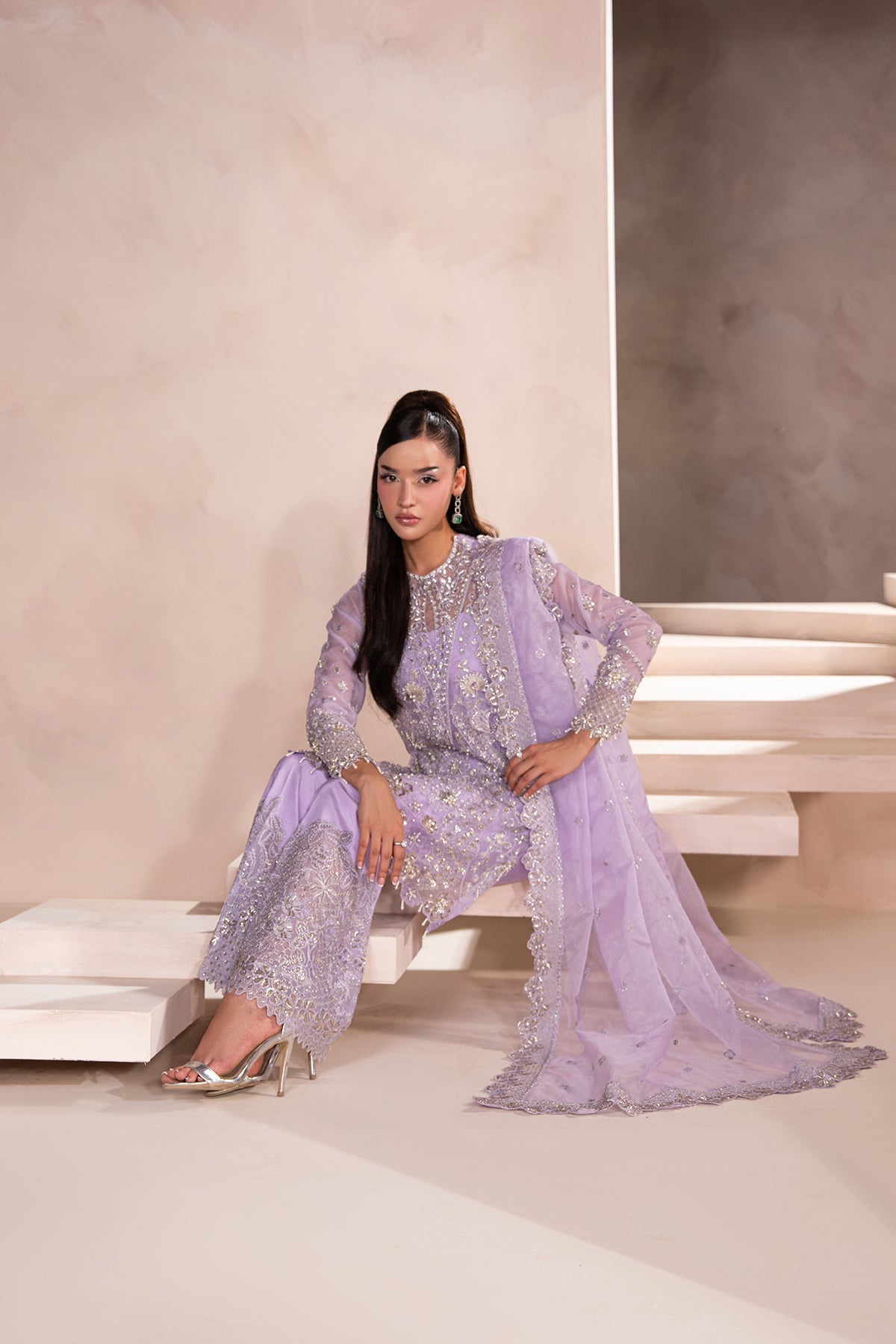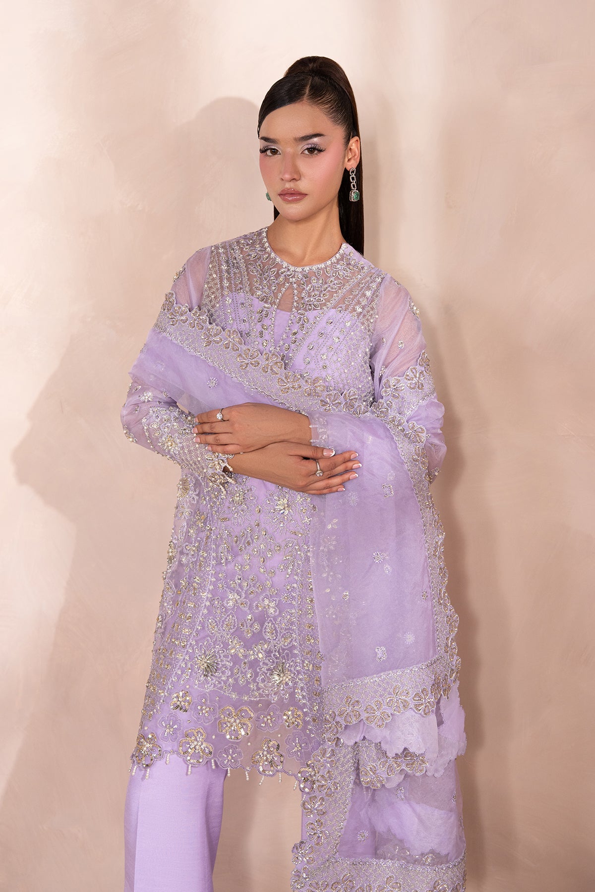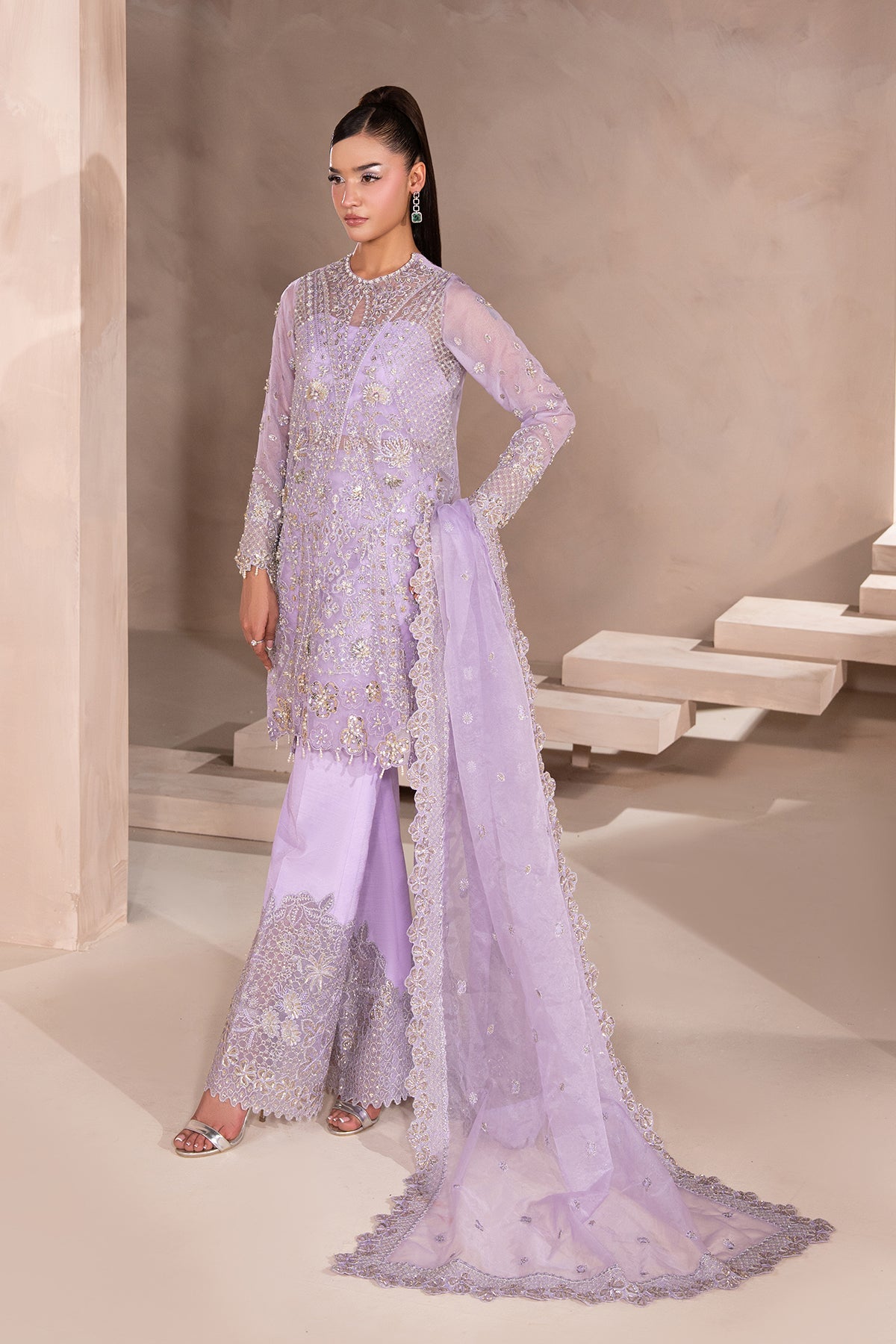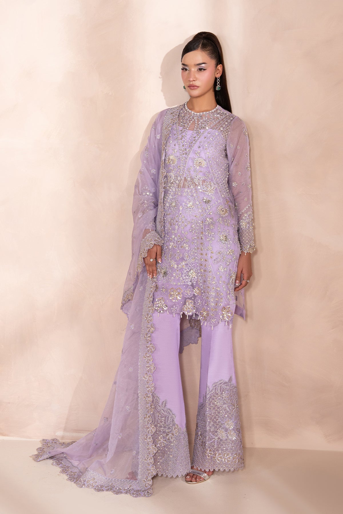 A Graceful Lavender outfit featuring a short organza shirt with a uniquely crafted, modern neckline, adorned with delicate silver embellishments that shimmer subtly. It's paired with bootcut-style pants in a sleek silhouette, adding structure and contrast to the airy top. The look is finished with a matching organza dupatta, elegantly bordered and detailed with fine silver work, enhancing the soft, ethereal vibe.