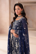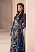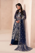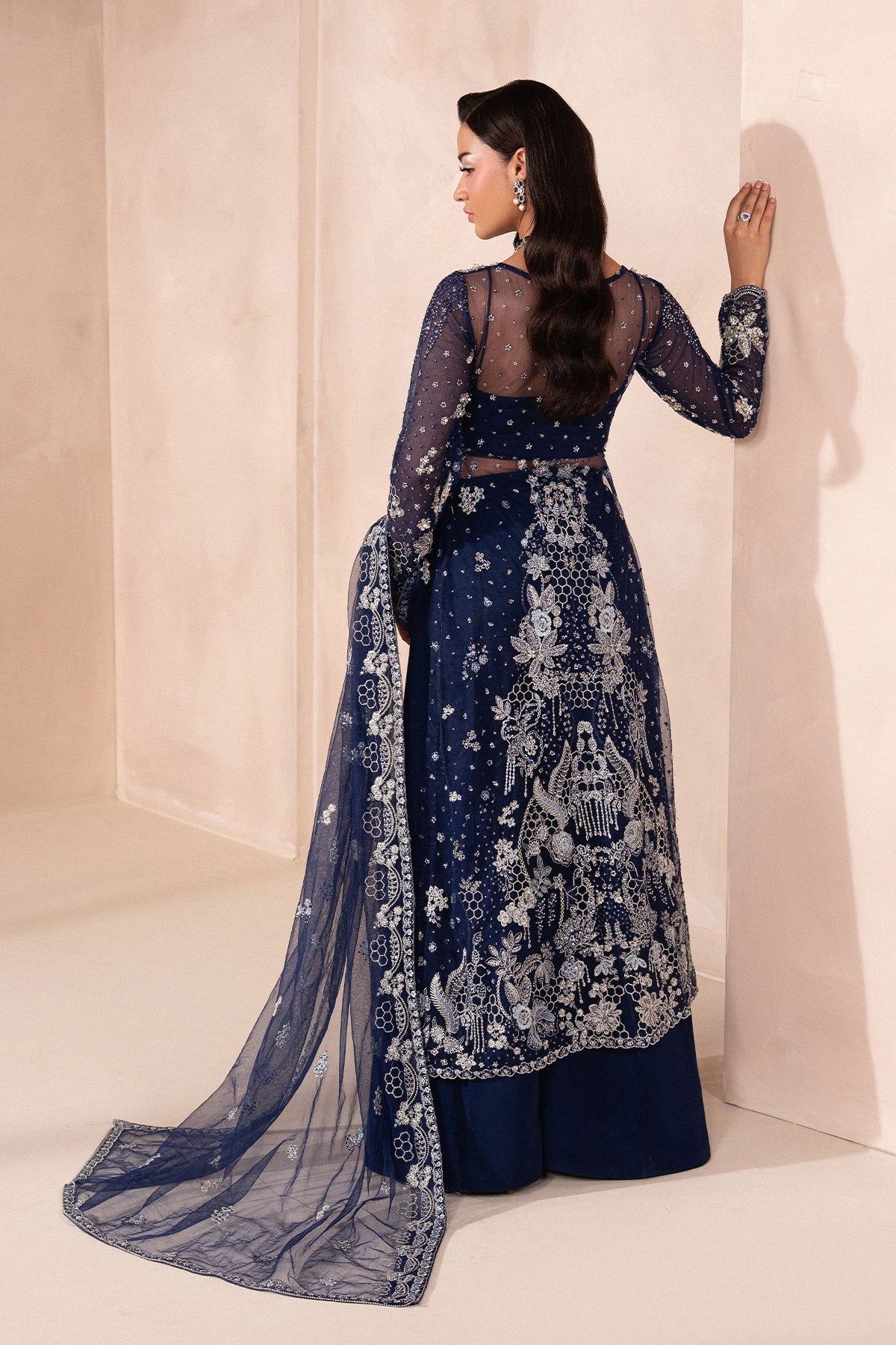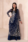 A Regal Navy Blue ensemble featuring a long, front-open shirt made from net fabric, flowing elegantly with a sheer, airy charm. The shirt is paired with flared pants, adding movement and a modern silhouette to the look.