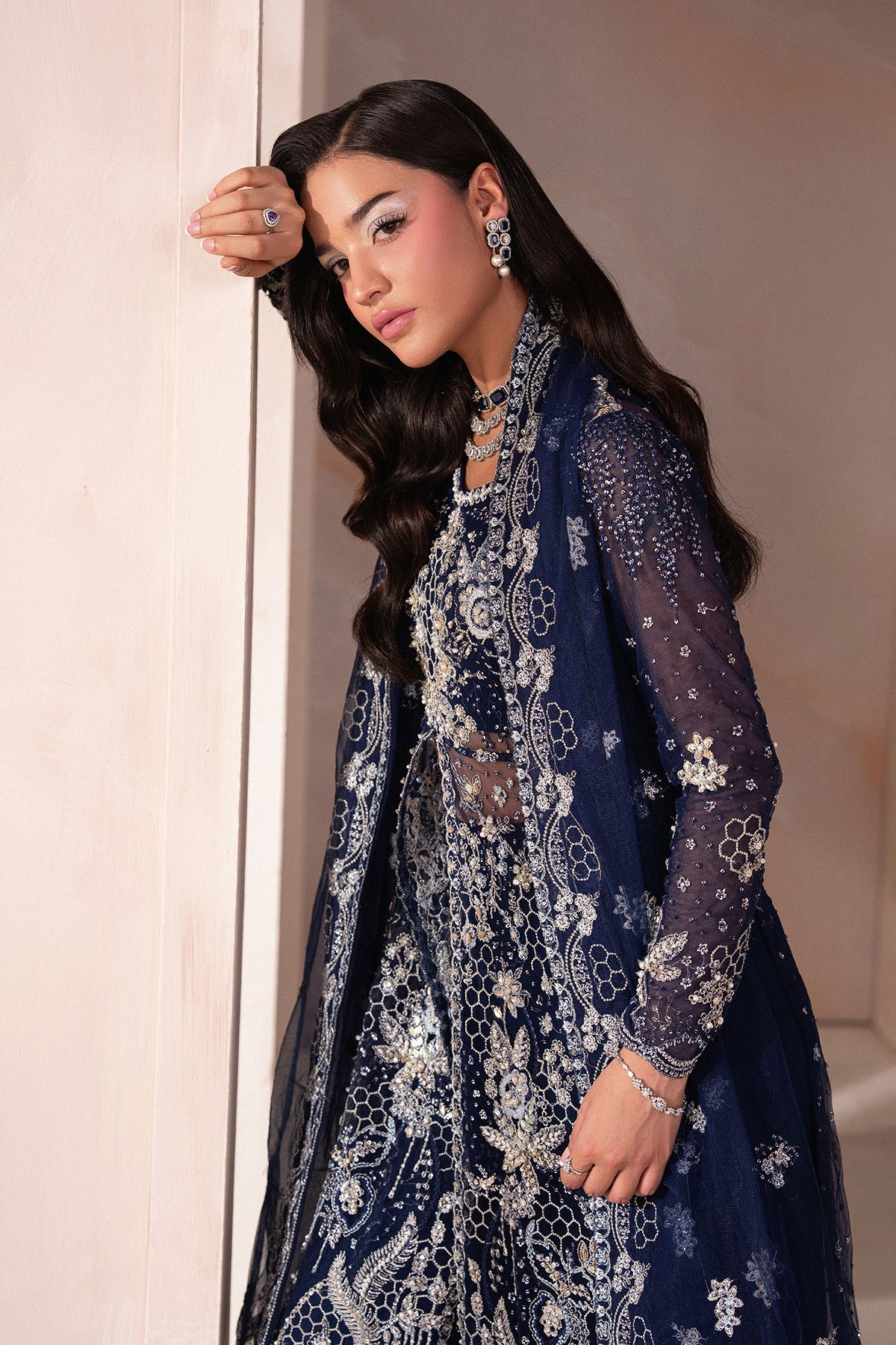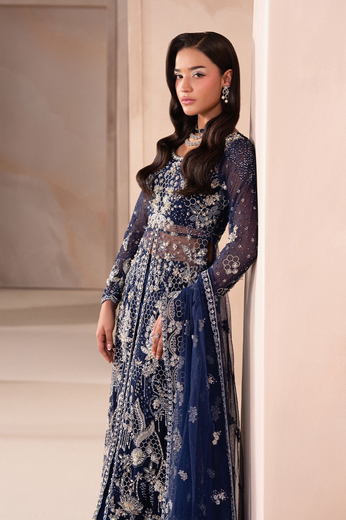 The highlight of the outfit is its net dupatta, designed with a very modern and unique touch, showcasing a long, continuous embellished border that adds sophistication and structure. Stylish and refined, this look blends contemporary design with classic elegance.