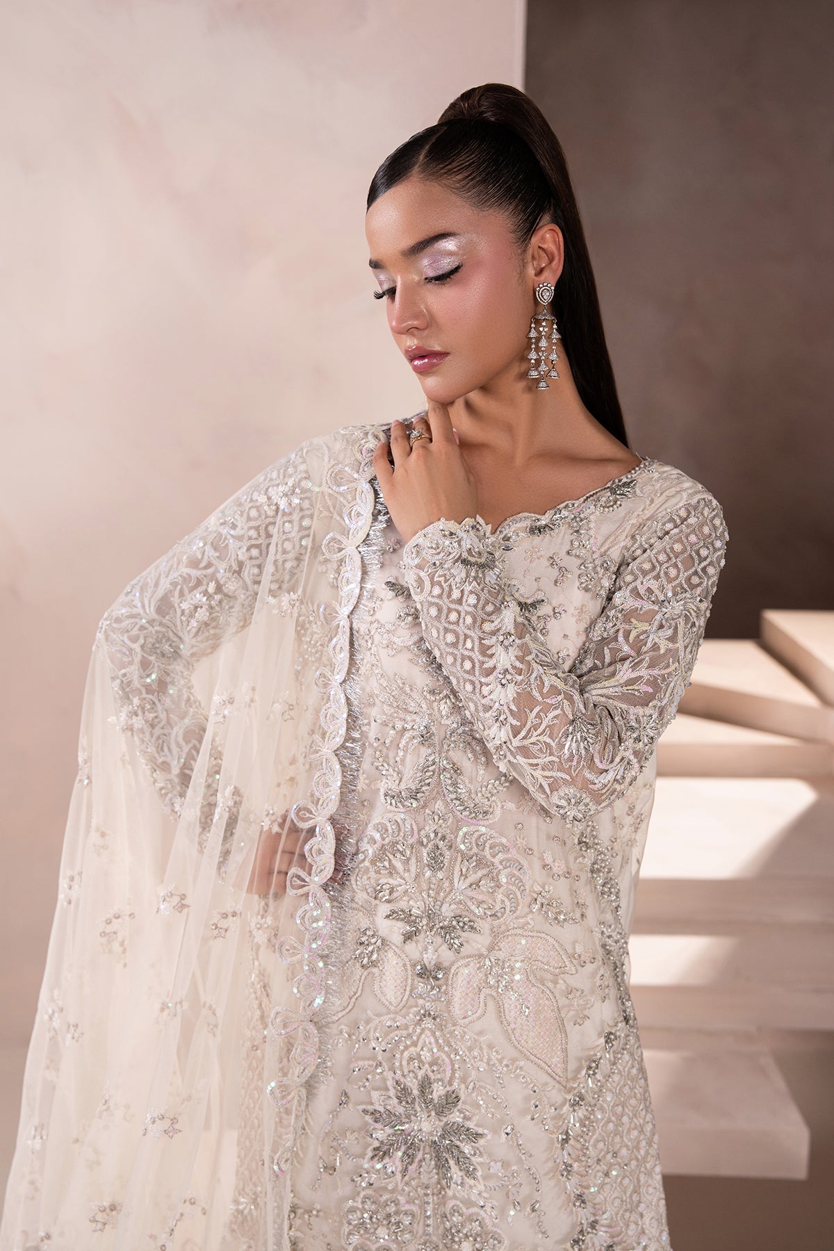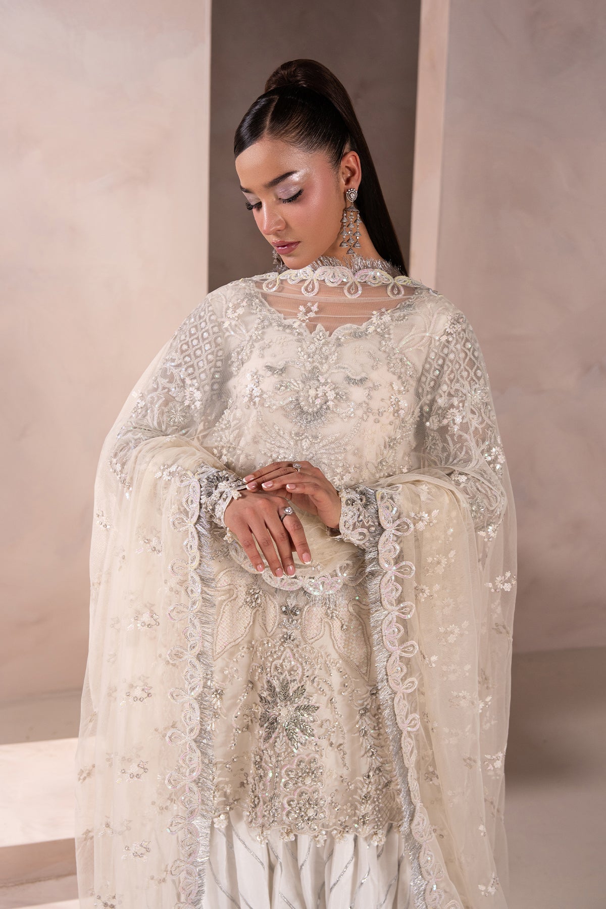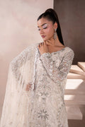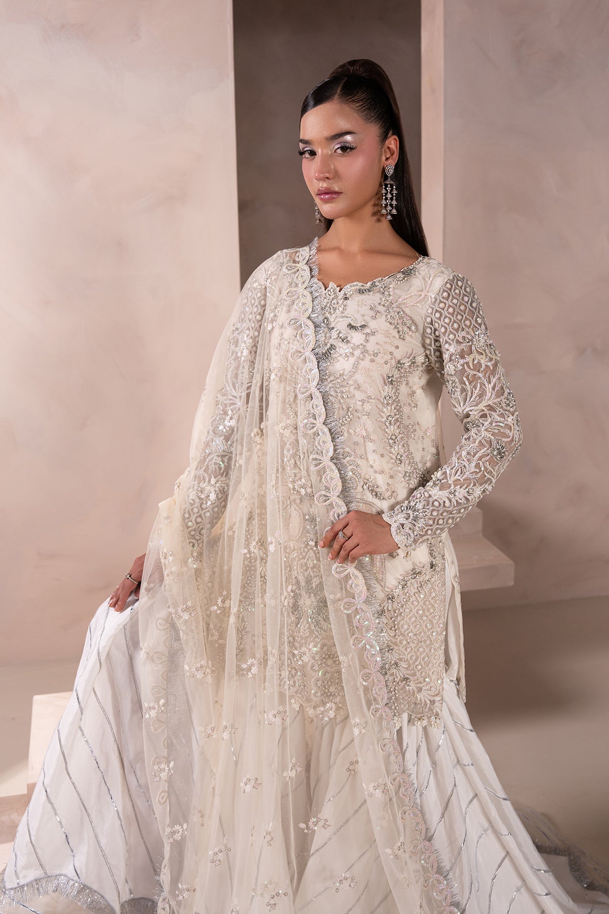 A Chic Off-White outfit with a short, embellished shirt featuring modern gold and ivory accents. Paired with a wide two-legged Garara and a dusty net dupatta edged with kiran borders and soft embellishments. Understated yet striking with a modern twist.