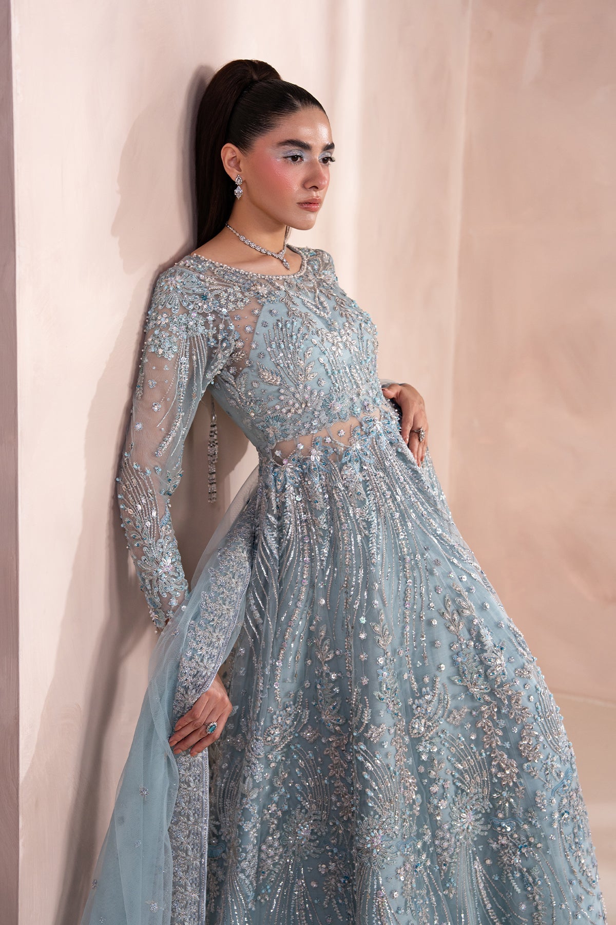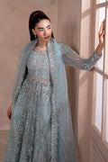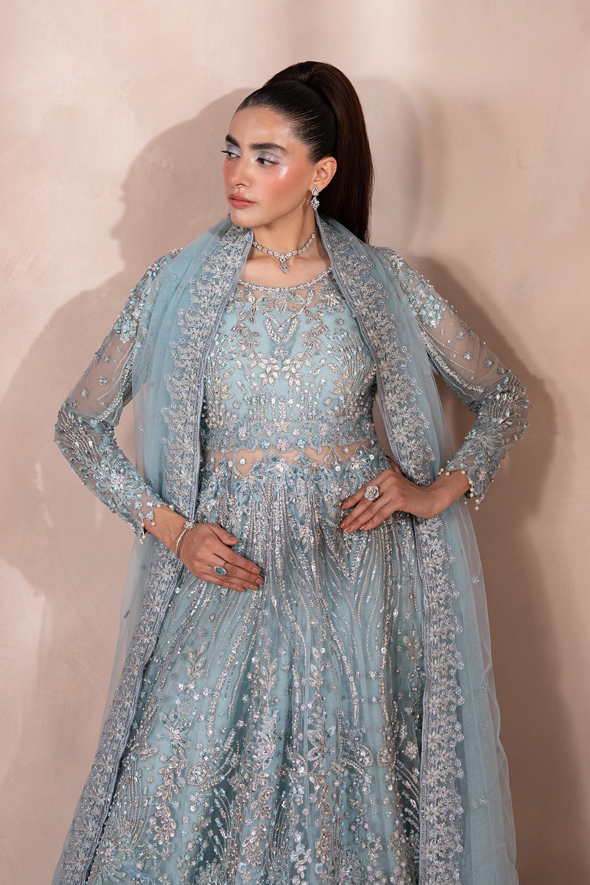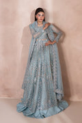 A Mesmerizing Ice Blue Net Pishwas featuring a graceful, floor-length silhouette layered over a long lehenga, creating a soft, regal flow. The entire outfit is adorned with modern, intricate embellishments and contemporary floral patterns, blending elegance with artistic detail. Paired with a matching net dupatta, delicately finished with embellished borders, the ensemble exudes ethereal charm and sophistication—perfect for a refined, fashion forward celebration.
