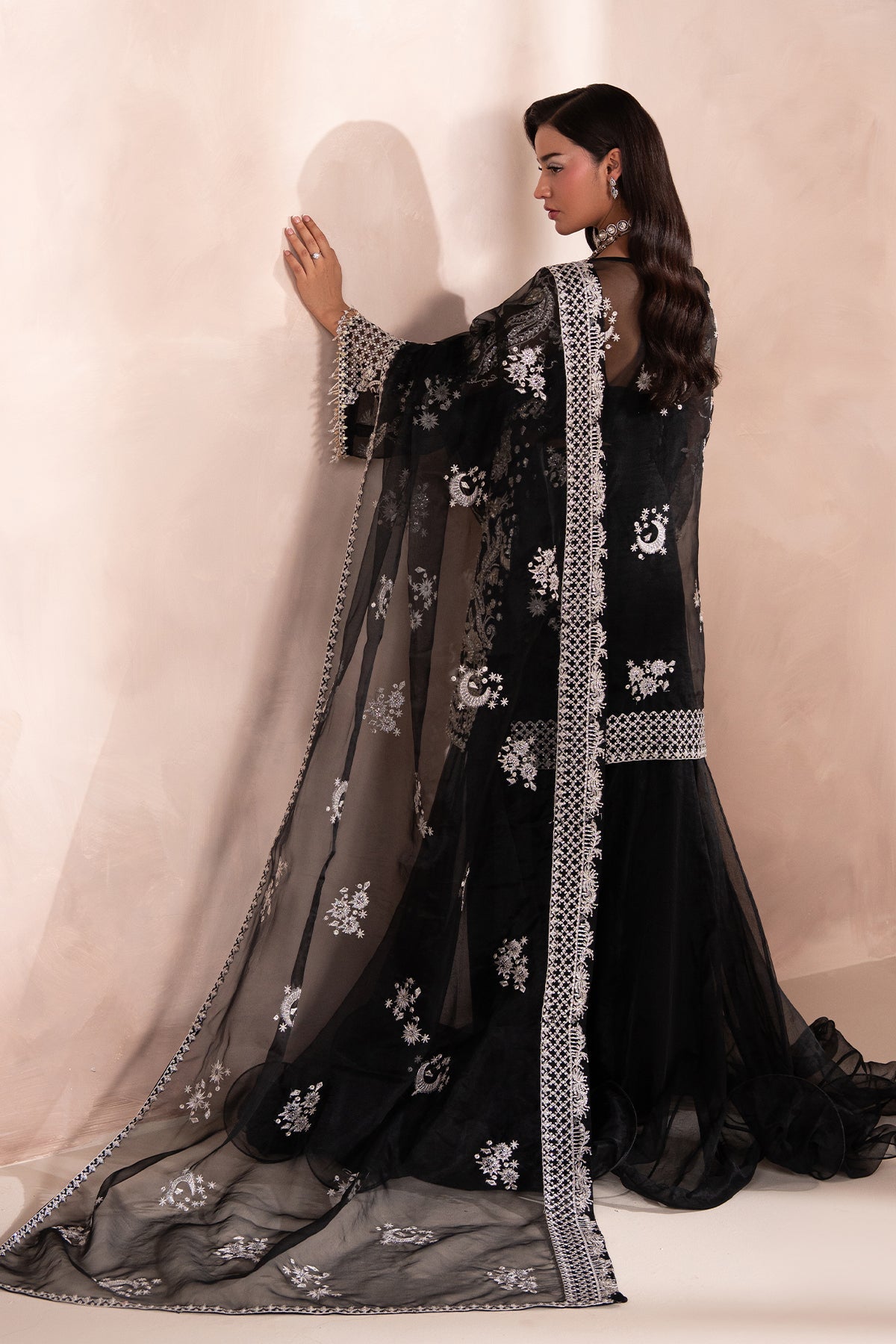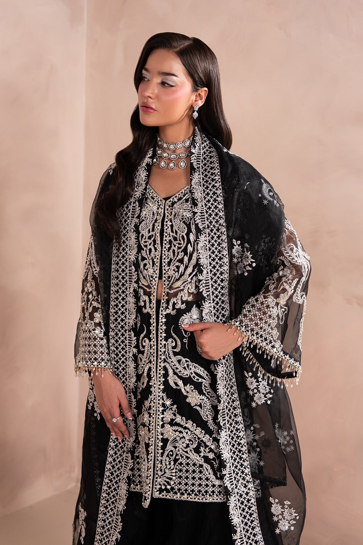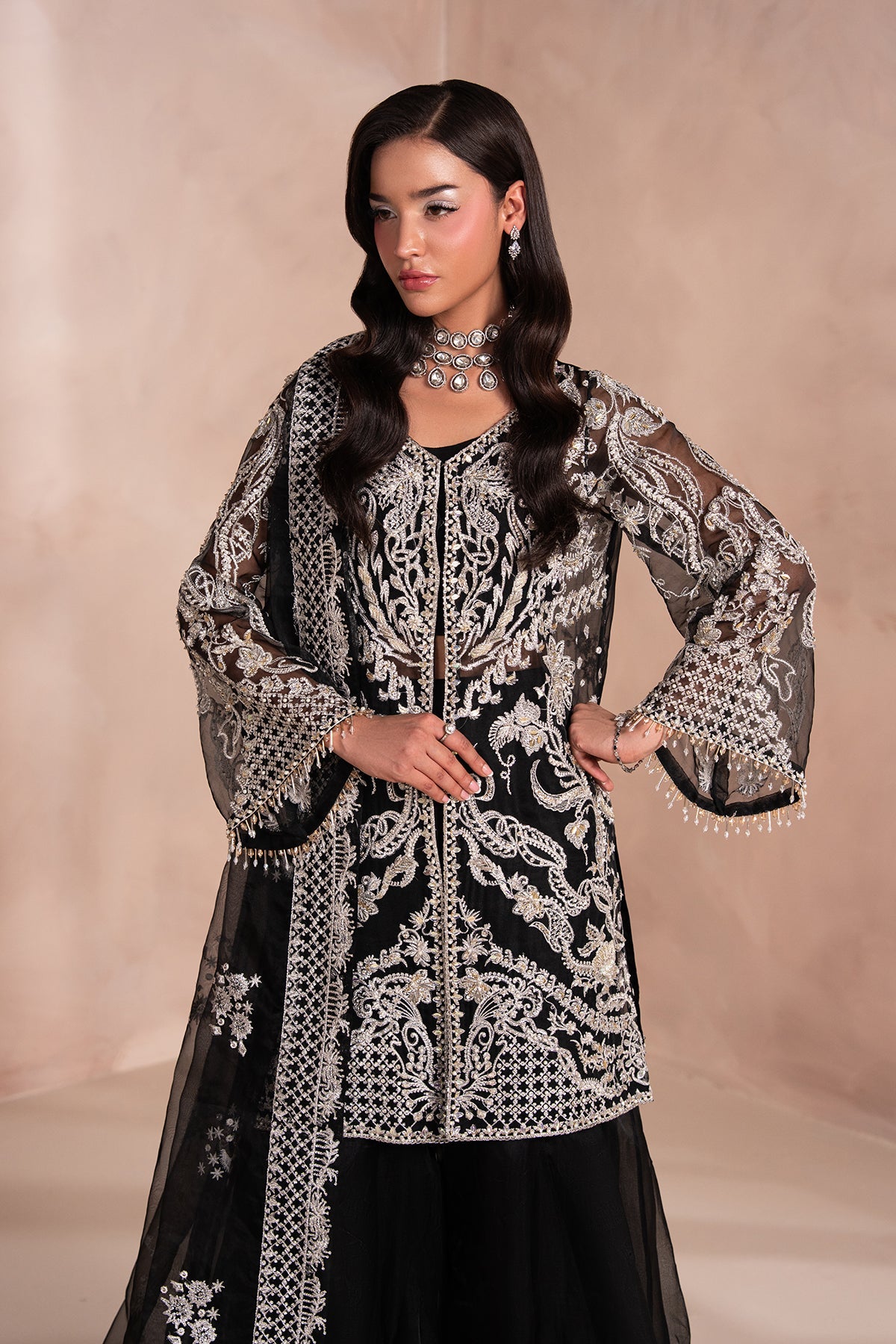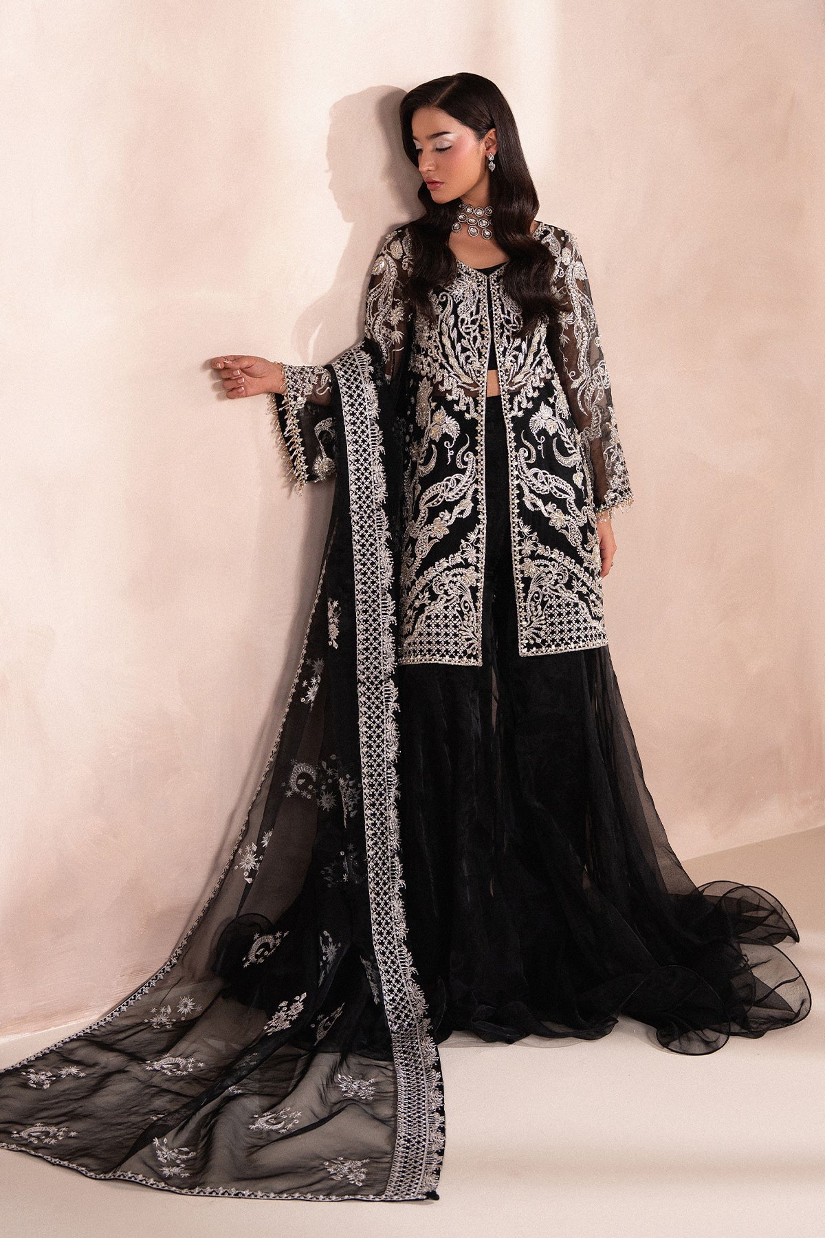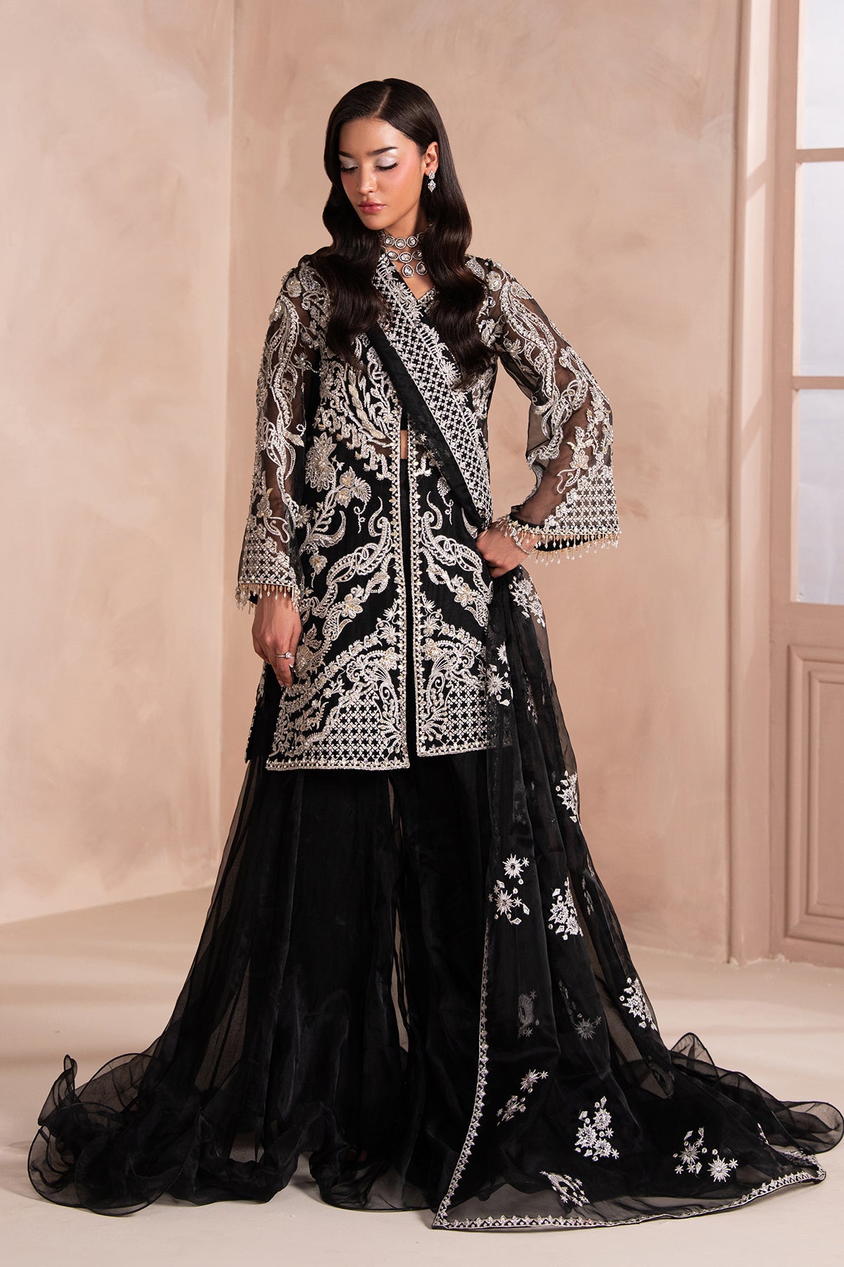 A Bold and Elegant Black outfit featuring a short, front-open shirt with subtle embellishments, giving it a refined yet modern edge. Paired with a flowing, long two-legged Organza Sharara, The look Balances Structure with Movement.