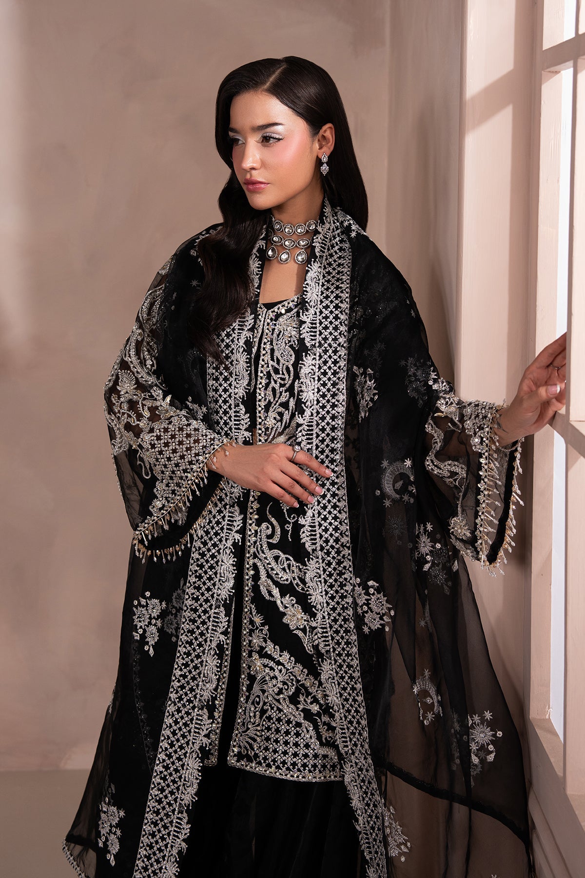 The matching dupatta is crafted from Sheer Fabric, adorned with embellished borders and a light spray of delicate embellishments across the center, adding just the right touch of sparkle. Sophisticated and timeless with a contemporary twist.