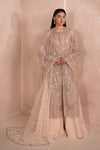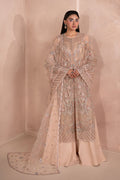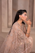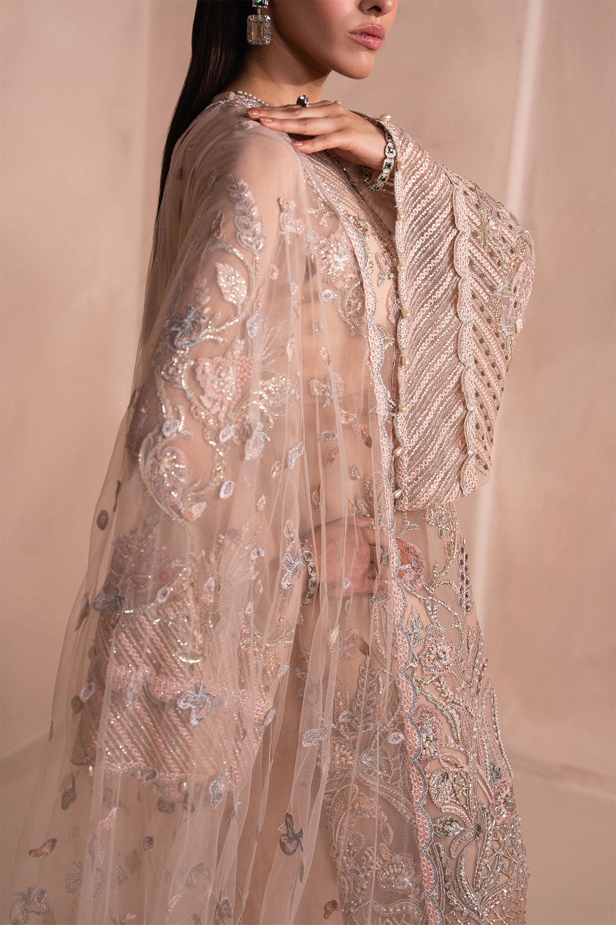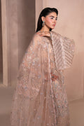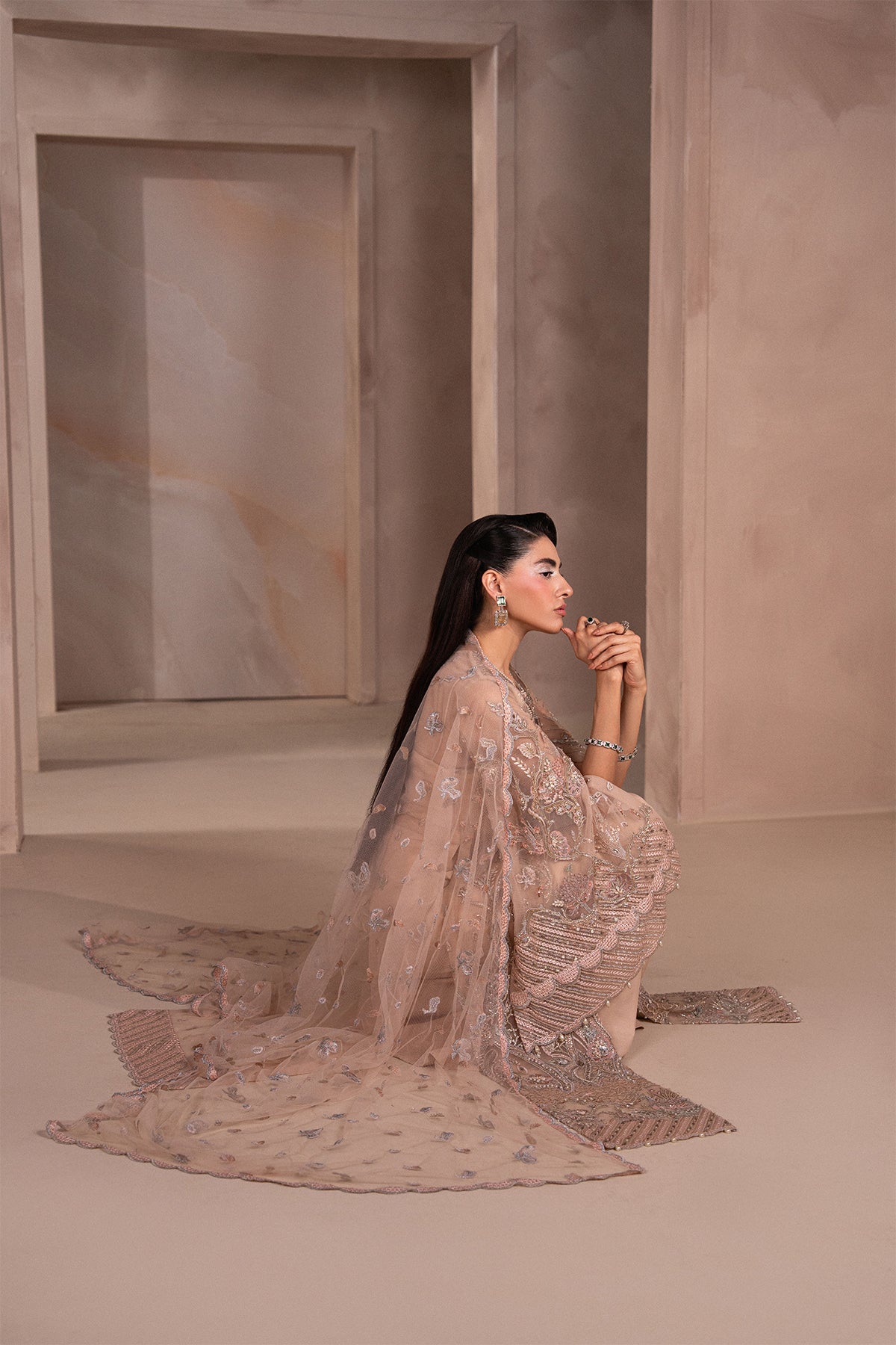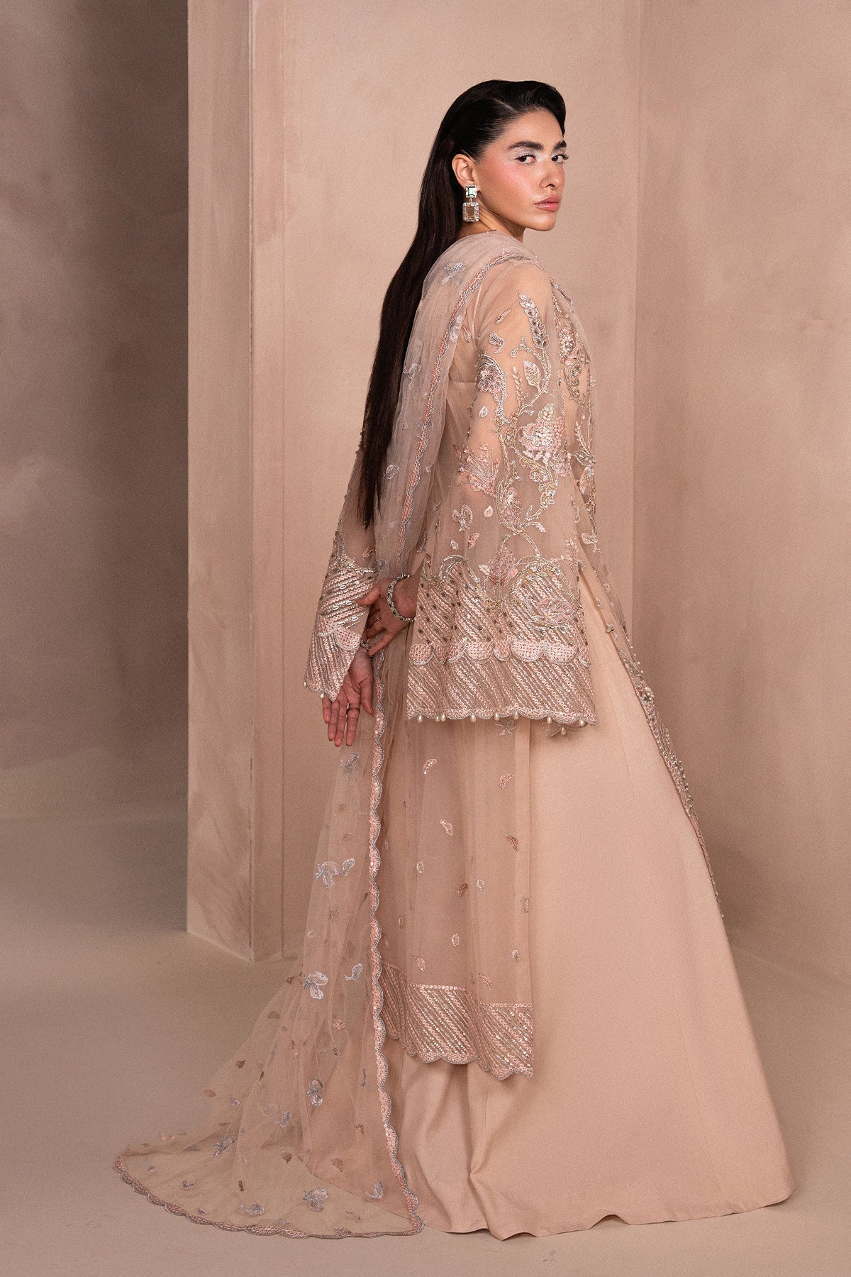 A Chic Dusty Peach outfit with a short, embellished shirt featuring modern gold and ivory accents. Paired with a wide two-legged Garara and a dusty net dupatta edged with kiran borders and soft embellishments. Understated yet striking with a modern twist.