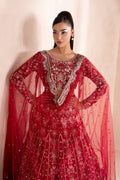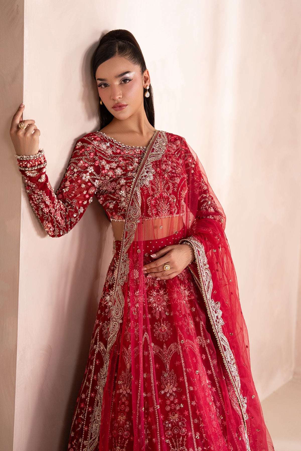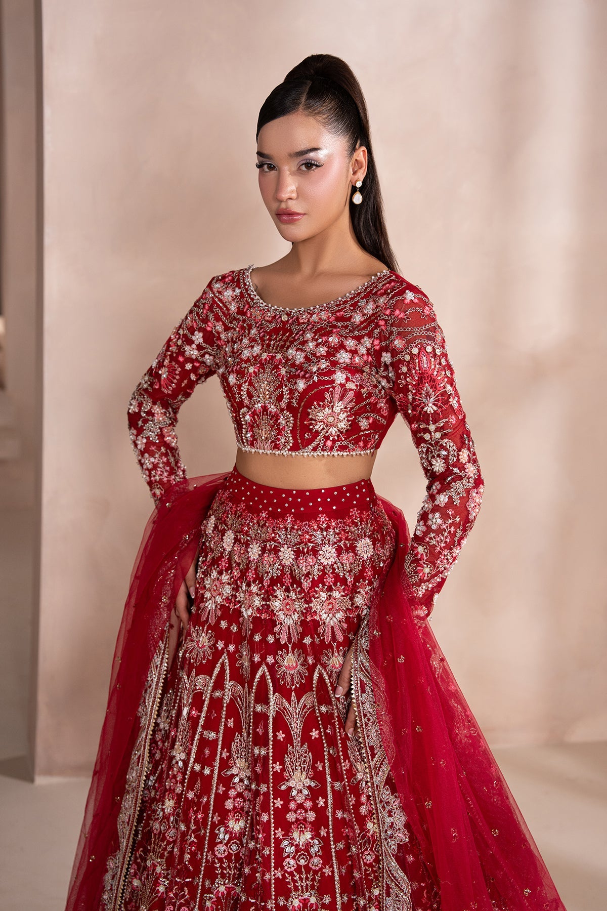 A Striking Red Lehenga Choli Set designed with a Contemporary, Cutline, Blending tradition with Bold modernity. The Lehenga features a sculpted silhouette with showcasing intricate Silver and Gold embellishments in edgy, artistic patterns. The choli is sharply tailored with structured neckline Paired with a sheer net dupatta, the look is completed with a boldly embellished border in Silver and Gold, adding just the right amount of drama while keeping the focus on the outfit's modern design language.